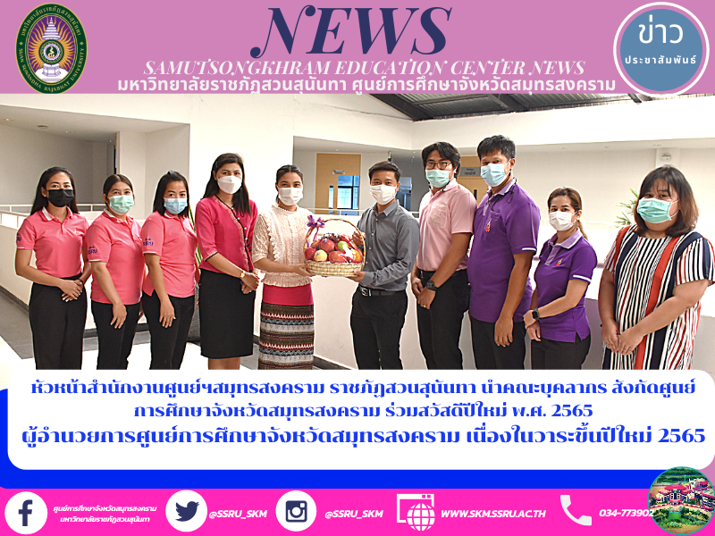 เช้านี้ (4 ม.ค.65) นายเอกชน น้อยเงิน หัวหน้าสำนักงานศูนย์การศึกษาจังหวัดสมุทรสงคราม มหาวิทยาลัยราชภัฏสวนสุนันทา นำหัวหน้างานและบุคลากรในสังกัดศูนย์การศึกษา เข้ามอบกระเช้าของขวัญสวัสดีปีใหม่ แด่ ผศ.ดร.ภญ.พิมพร ทองเมือง ผู้อำนวยการฯ พร้อมรับคำอวยพรเนื่องในวาระดิถีต้อนรับปีพุทธศักราชใหม่จากท่านผู้อำนวยการเพื่อเป็นขวัญและกำลังใจในการปฏิบัติงาน