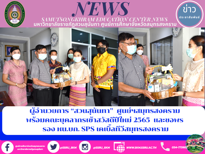 วันพุธที่ 5 มกราคม พ.ศ. 2565 เวลา ๑๕.๐๐ น. ผู้ช่วยศาสตร์จารย์ ดร.ภญ.พิมพร ทองเมือง ผู้อำนวยการศูนย์การศึกษาจังหวัดสมุทรสงคราม มหาวิทยาลัยราชภัฏสวนสุนันทา พร้อมด้วยนายเอกชน น้อยเงิน หัวหน้าสำนักงานฯ นำบุคลากรในสังกัด เข้าสวัสดีปีใหม่ นายมานพ จันทร์ฤทธิ์ รอง หน.บก. SPS เคเบิ้ลทีวีสมุทรสงคราม เพื่อขอพร เนื่องในวาระขึ้นปีใหม่ ๒๕๖๕