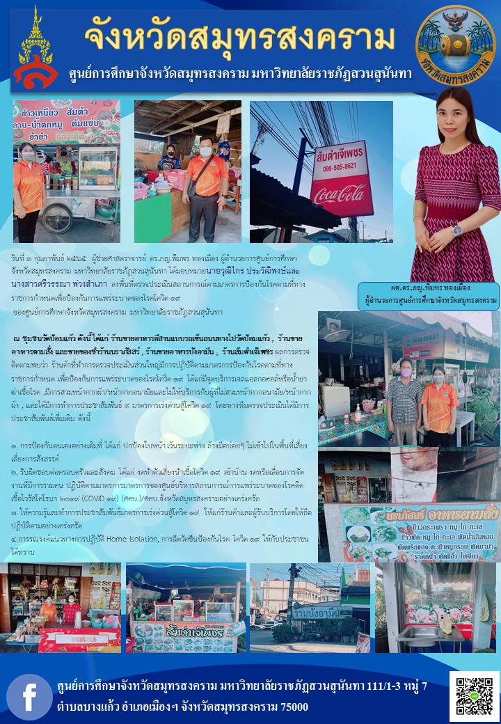 > มหาวิทยาลัยราชภัฏสวนสุนันทา ศูนย์การศึกษาจังหวัดสมุทรสงคราม ลงพื้นที่ตรวจประเมินสถานการณ์ตามมาตรการป้องกันโรคตามที่ทางราชการกำหนดเพื่อป้องกันการแพร่ระบาดของ โรคโควิด-๑๙