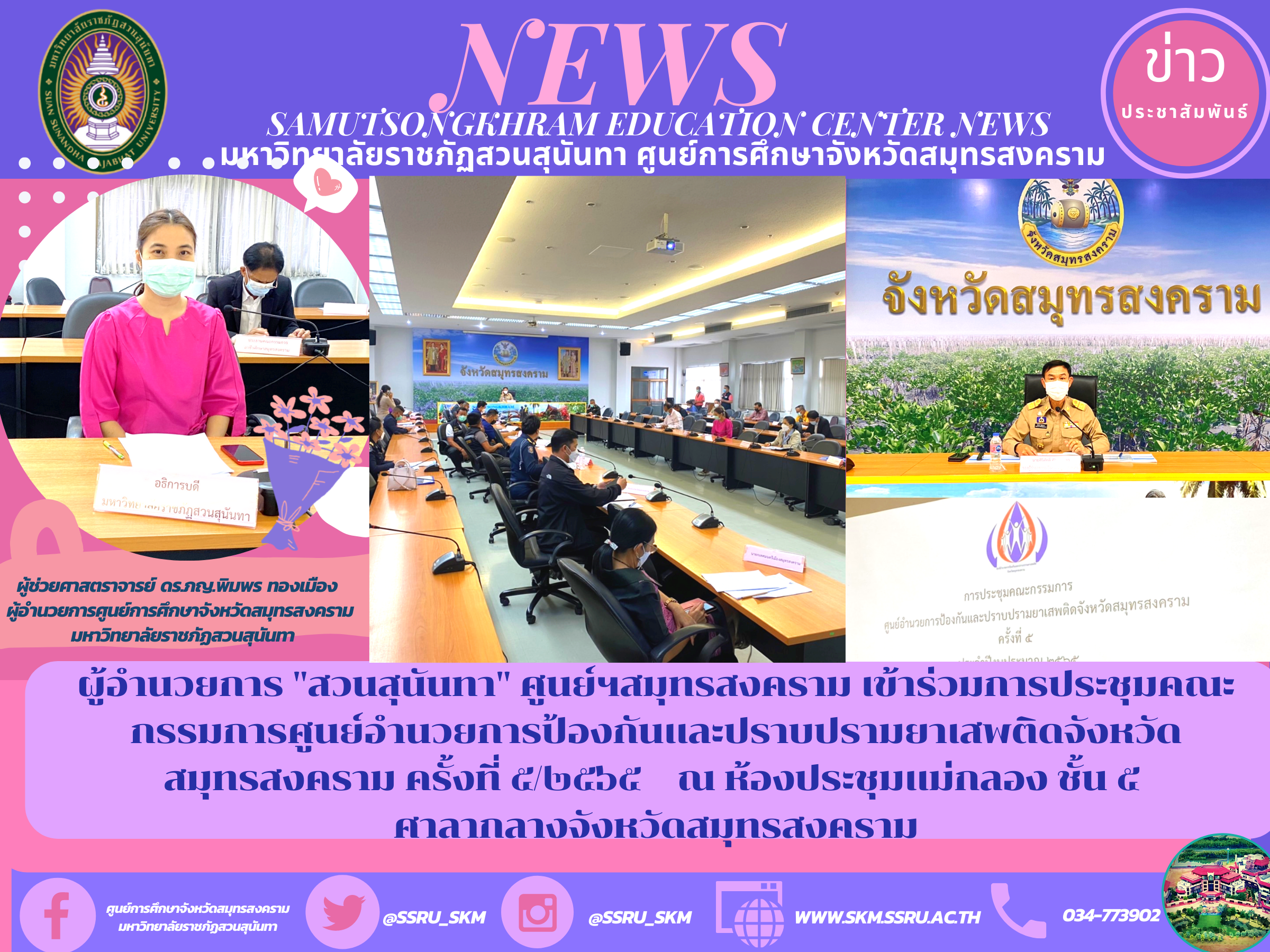 วันนี้ (22 กุมภาพันธ์ 2565) ผู้ช่วยศาสตราจารย์ ดร.ภญ.พิมพร ทองเมือง ผู้อำนวยการศูนย์การศึกษาจังหวัดสมุทรสงคราม มหาวิทยาลัยราชภัฏสวนสุนันทา เข้าร่วมการประชุมคณะกรรมการศูนย์อำนวยการป้องกันและปราบปรามยาเสพติดจังหวัดสมุทรสงคราม ครั้งที่ ๕/๒๕๖๕ ประจำเดือนกุมภาพันธ์ 2565 โดยมีนายศิริศักดิ์ ศิริมังคะ ผู้ว่าราชการจังหวัดสมุทรสงคราม เป็นประธานประชุมคณะกรรมการศูนย์อำนวยการป้องกันและปราบปรามยาเสพติดจังหวัด ณ ห้องประชุมชั้น 5 ศาลากลางจังหวัดฯ
