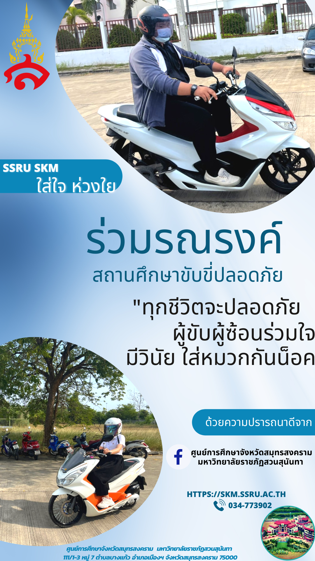 > SSRU SKM ใส่ใจ ห่วงใย ร่วมรณรงค์ สถานศึกษาขับขี่ปลอดภัย "ทุกชีวิตจะปลอดภัย ผู้ขับผู้ซ้อนร่วมใจ มีวินัย ใส่หมวกกันน็อค