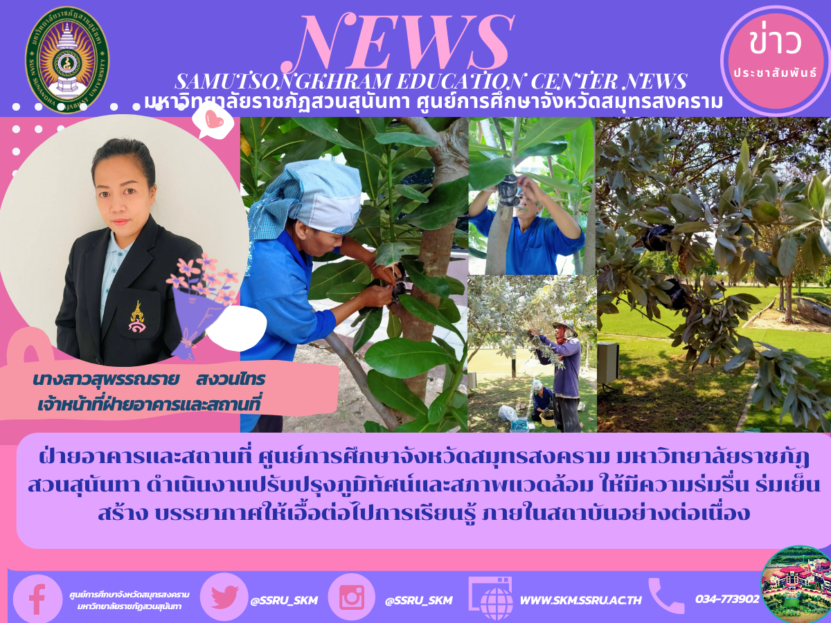 ฝ่ายอาคารและสถานที่ ศูนย์การศึกษาจังหวัดสมุทรสงคราม มหาวิทยาลัยราชภัฏสวนสุนันทา ดำเนินงานปรับปรุงภูมิทัศน์และสภาพแวดล้อม ให้มีความร่มรื่น ร่มเย็น สร้าง บรรยากาศให้เอื้อต่อไปการเรียนรู้ ภายในสถาบันอย่างต่อเนื่อง
