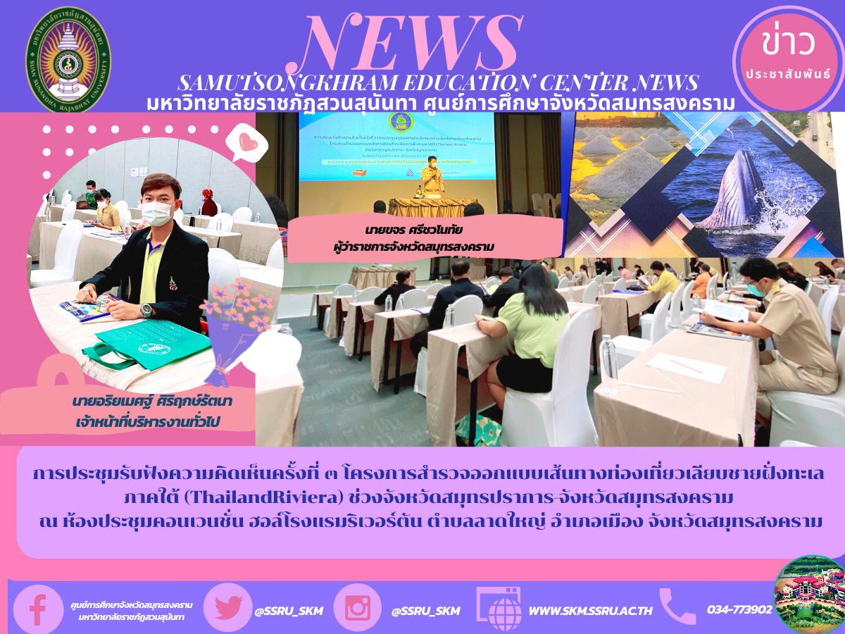 (14 มี.ค. 65) เวลา 08.30 น. ผู้ช่วยศาสตราจารย์ ดร.ภญ.พิมพร ทองเมือง ผู้อำนวยการศูนย์การศึกษาจังหวัดสมุทรสงคราม มหาวิทยาลัยราชภัฏสวนสุนันทา มอบหมายให้นายอริยเมศฐ์ ศิริฤกษ์รัตนา เจ้าหน้าที่บริหารงานทั่วไป เข้าร่วมการประชุมรับฟังความคิดเห็นครั้งที่ ๓ โครงการสำรวจออกแบบเส้นทางท่องเที่ยวเลียบชายฝั่งทะเลภาคใต้ (ThailandRiviera) ช่วงจังหวัดสมุทรปราการ-จังหวัดสมุทรสงคราม โดยมีนายขจร ศรีชวโนทัย ผู้ว่าราชการจังหวัดสมุทรสงคราม เป็นประธานเปิดโครงการฯ ณ ห้องประชุมคอนเวนชั่น ฮอล์โรงแรมริเวอร์ตัน ตำบลลาดใหญ่ อำเภอเมือง จังหวัดสมุทรสงคราม
