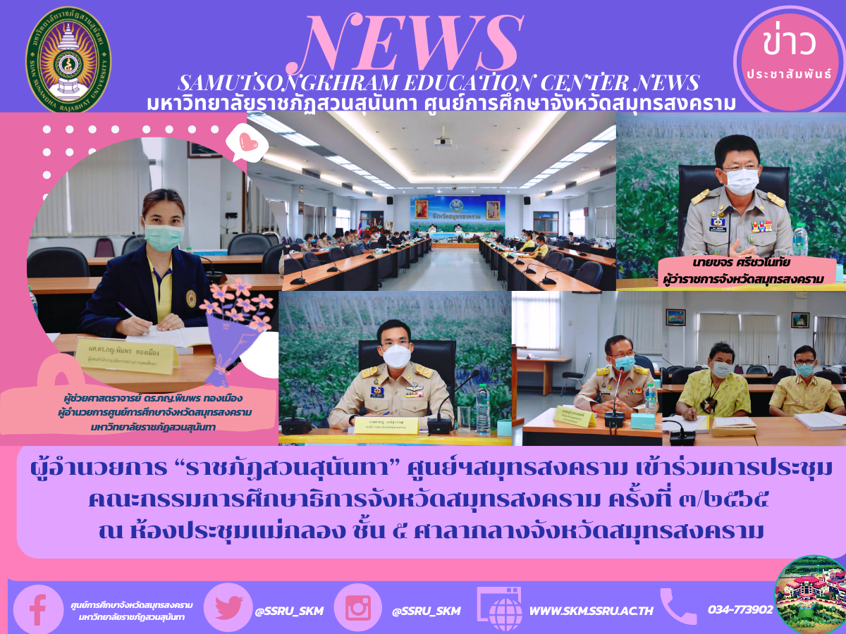(14 มีนาคม 65) เวลา 13.30 น. ผู้ช่วยศาสตราจารย์ ดร.ภญ.พิมพร ทองเมือง ผู้อำนวยการศูนย์การศึกษาจังหวัดสมุทรสงคราม มหาวิทยาลัยราชภัฏสวนสุนันทา เข้าร่วมการประชุมคณะกรรมการศึกษาธิการจังหวัดสมุทรสงคราม ครั้งที่ 3/2565 โดยมี นายขจร ศรีชวโนทัย ผู้ว่าราชการจังหวัดสมุทรสงครามเป็นประธานในการประชุม พร้อมนายกรกฎ วงษ์สุวรรณ รองผู้ว่าราชการจังหวัดสมุทรสงคราม และนายสมภูมิ ธรรมายอดดี ศึกษาธิการจังหวัดสมุทรสงคราม ปฏิบัติหน้าที่เลขานุการ และคณะกรรมการศึกษาธิการจังหวัดและเจ้าหน้าที่ที่เกี่ยวข้อง เข้าร่วมการประชุมฯ เพื่อร่วมพิจารณาในข้อราชการสังกัดศึกษาธิการ ณ ห้องแม่กลอง ชั้น 5 ศาลากลางจังหวัดสมุทรสงคราม