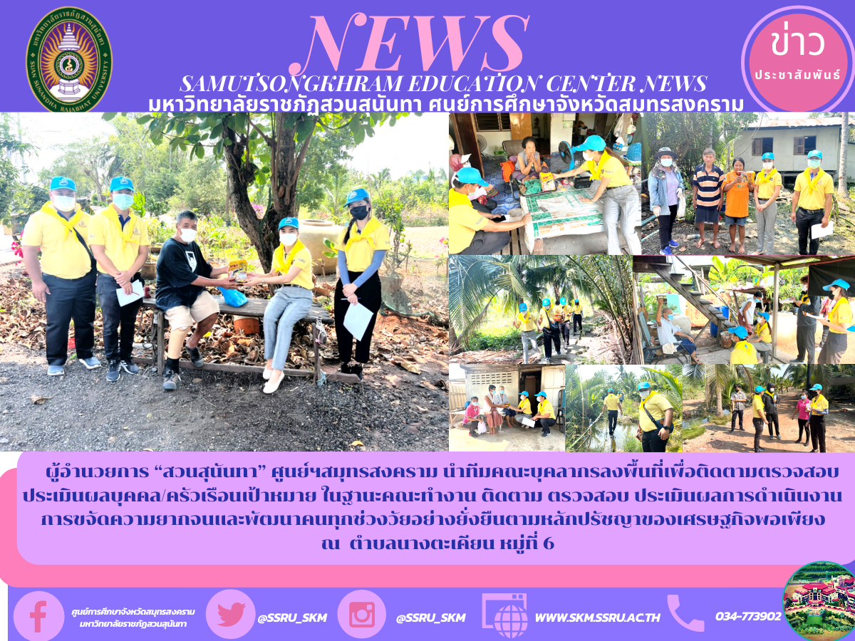 (15 มี.ค. 65) ผู้ช่วยศาสตราจารย์ ดร.ภญ.พิมพร ทองเมือง ผู้อำนวยการศูนย์การศึกษาจังหวัดสมุทรสงคราม มหาวิทยาลัยราชภัฏสวนสุนันทา พร้อมด้วยนายเอกชน น้อยเงิน หัวหน้าสำนักงานฯ นำทีมคณะบุคลากรลงพื้นที่เพื่อติดตามตรวจสอบประเมินผลบุคคล/ครัวเรือนเป้าหมาย ในฐานะคณะทำงาน ติดตาม ตรวจสอบ ประเมินผลการดำเนินงาน การขจัดความยากจนและพัฒนาคนทุกช่วงวัยอย่างยั่งยืนตามหลักปรัชญาของเศรษฐกิจพอเพียง