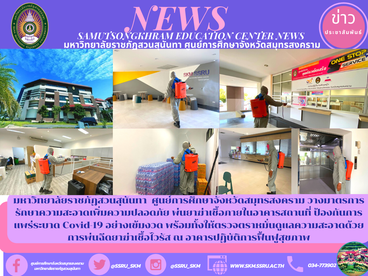 มหาวิทยาลัยราชภัฏสวนสุนันทา ศูนย์การศึกษาจังหวัดสมุทรสงคราม วางมาตรการรักษาความสะอาดเพิ่มความปลอดภัย พ่นยาฆ่าเชื้อภายในอาคารสถานที่ ป้องกันการแพร่ระบาด Covid-19 อย่างเข้มงวด พร้อมทั้งให้ตรวจตราหมั่นดูแลความสะอาดด้วยการพ่นฉีดยาฆ่าเชื้อไวรัส ณ อาคารปฏิบัติการฟื้นฟูสุขภาพ