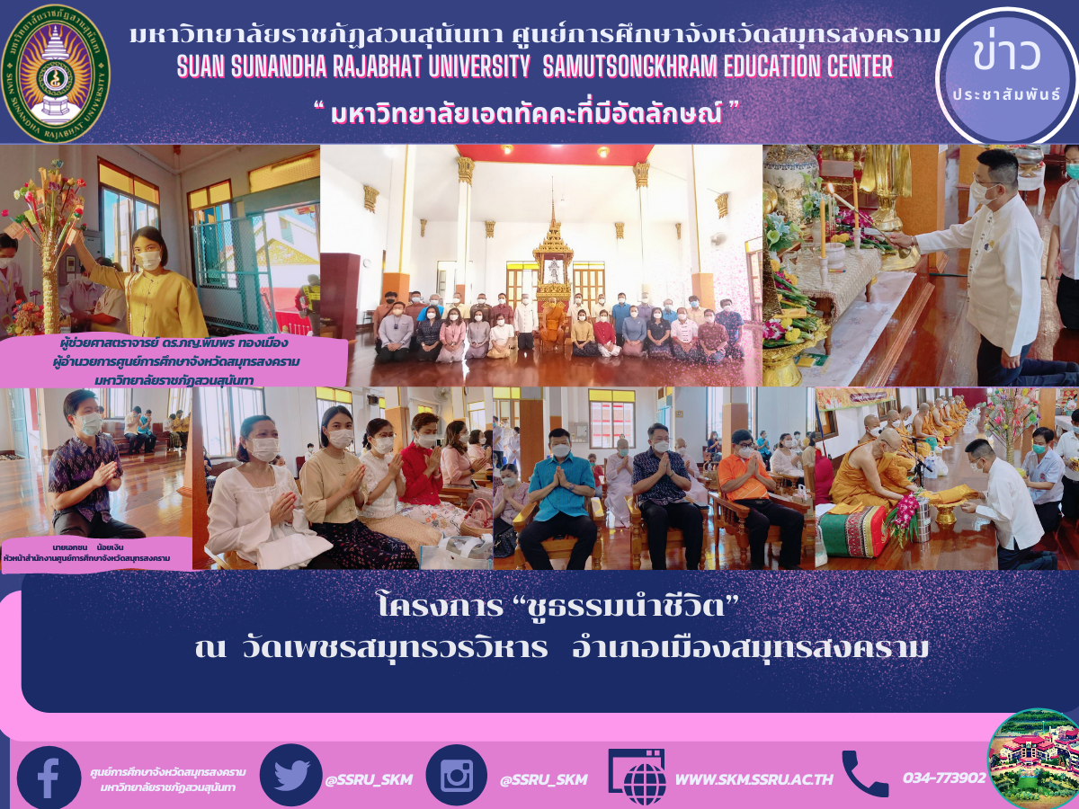 (17 มี.ค. 65) เวลา 08.00 น. ผู้ช่วยศาสตราจารย์ ดร.ภญ.พิมพร ทองเมือง ผู้อำนวยการศูนย์การศึกษาจังหวัดสมุทรสงคราม มหาวิทยาลัยราชภัฏสวนสุนันทา พร้อมด้วยนายเอกชน น้อยเงิน หัวหน้าสำนักงานฯ เข้าร่วมทำบุญตักบาตร ตามโครงการ “ชูธรรมนำชีวิต” ณ วัดเพชรสมุทรวรวิหาร อำเภอเมืองสมุทรสงคราม โดยมีนายขจร ศรีชวโนทัย ผู้ว่าราชการจังหวัดสมุทรสงคราม เป็นประธาน ฝ่ายฆราวาสจุดธูปเทียนบูชาพระรัตนตรัย ถวายพัดรองที่ระลึก พระสมุทรวชิรโสภณ เจ้าอาวาสวัดเพชรสมุทรวรวิหาร พระอารามหลวง ประธานฝ่ายสงฆ์ พร้อมด้วยหัวหน้าส่วนราชการ ข้าราชการ พุทธศาสนิกชน เข้าร่วมโครงการดังกล่าว