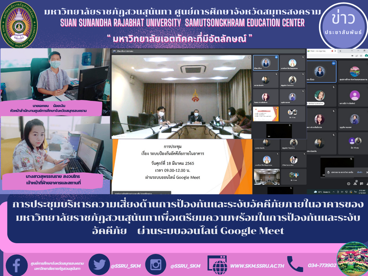 (18 มี.ค. 65) เวลา 09.00 น. นายเอกชน น้อยเงิน หัวหน้าสำนักงานศูนย์การศึกษาจังหวัดสมุทรสงคราม มหาวิทยาลัยราชภัฏสวนสุนันทา พร้อมด้วยนางสาวสุพรรณราย สงวนไทร เจ้าหน้าที่ฝ่ายงานอาคารและสถานที่ เข้าร่วม การประชุมบริหารความเสี่ยงด้านการป้องกันและระงับอัคคีภัยภายในอาคารของมหาวิทยาลัยราชภัฏสวนสุนันทา เพื่อเตรียมความพร้อมในการป้องกันและระงับอัคคีภัย ผ่านระบบออนไลน์ Google Meet โดยมีนายชำนิ นิลอรุณ รักษาการในตำแหน่งผู้อำนวยการสำนักงานอธิการบดี เป็นประธานการประชุมฯ