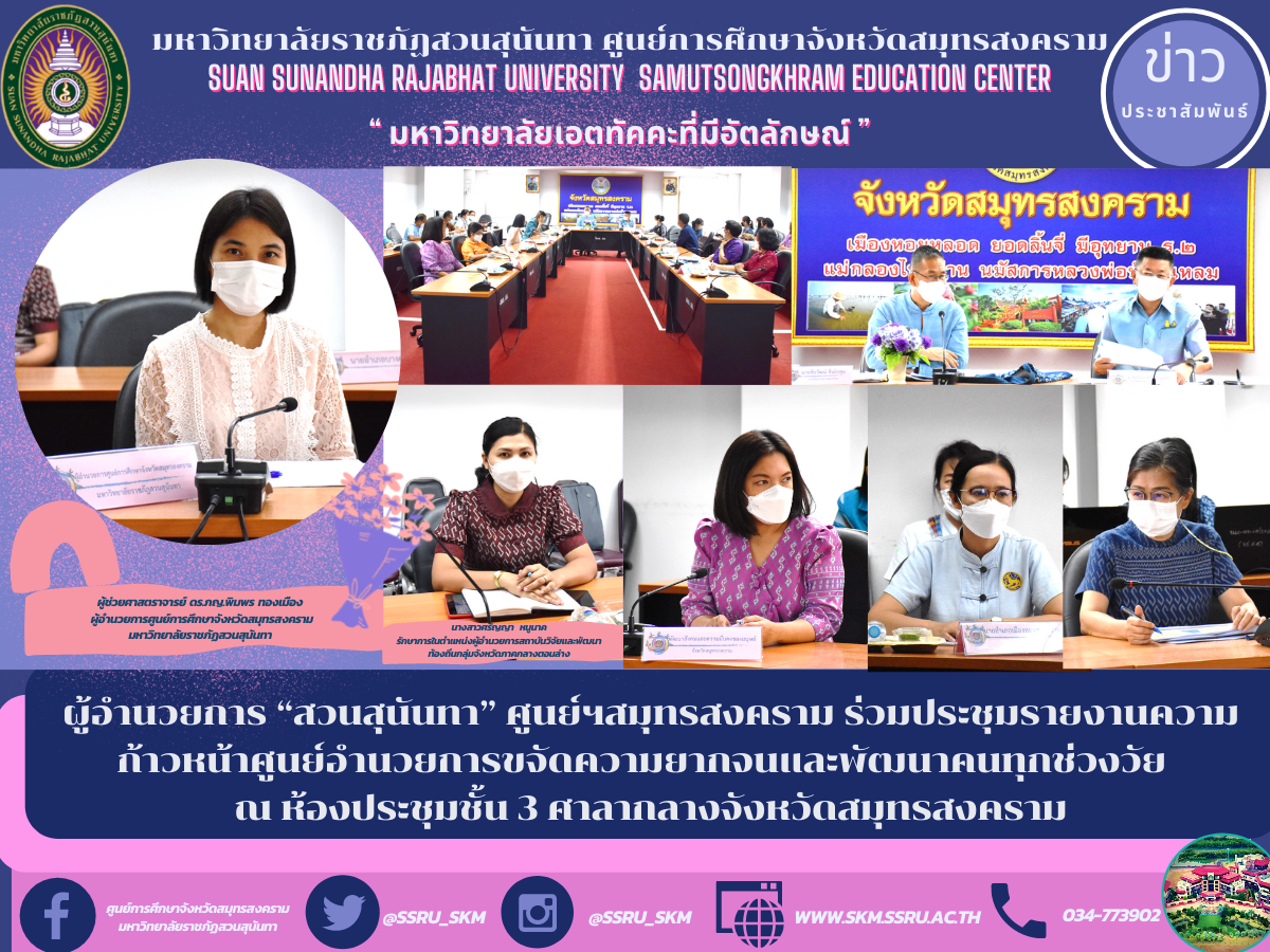 (18 มี.ค. 65) เวลา 13.00 น. ผู้ช่วยศาสตราจารย์ ดร.ภญ.พิมพร ทองเมือง ผู้อำนวยการศูนย์การศึกษาจังหวัดสมุทรสงคราม มหาวิทยาลัยราชภัฏสวนสุนันทา พร้อมด้วยนางสาวศรัญญา หนูนาค รักษาการผู้อำนวยการสถาบันวิจัยและพัฒนาท้องถิ่นกลุ่มจังหวัดภาคกลางตอนล่าง ร่วมการประชุมรายงานความก้าวหน้าศูนย์อำนวยการขจัดความยากจนและพัฒนาคนทุกช่วงวัย โดยมีนายชัยวัฒน์ ชื่นโกสุม รองปลัดกระทรวงมหาดไทย รับฟังการรายงานผลการติดตามฯ และนายขจร ศรีชวโนทัย ผู้ว่าราชการจังหวัดสมุทรสงคราม พร้อมด้วยคณะทำงานทุกภาคส่วนที่เกี่ยวข้อง ให้การต้อนรับและรายงานการขับเคลื่อนการขจัดความยากจนและพัฒนาคนทุกช่วงวัยอย่างยั่งยืนของจังหวัดสมุทรสงคราม ณ ห้องประชุมชั้น 3 ศาลากลางจังหวัดสมุทรสงคราม