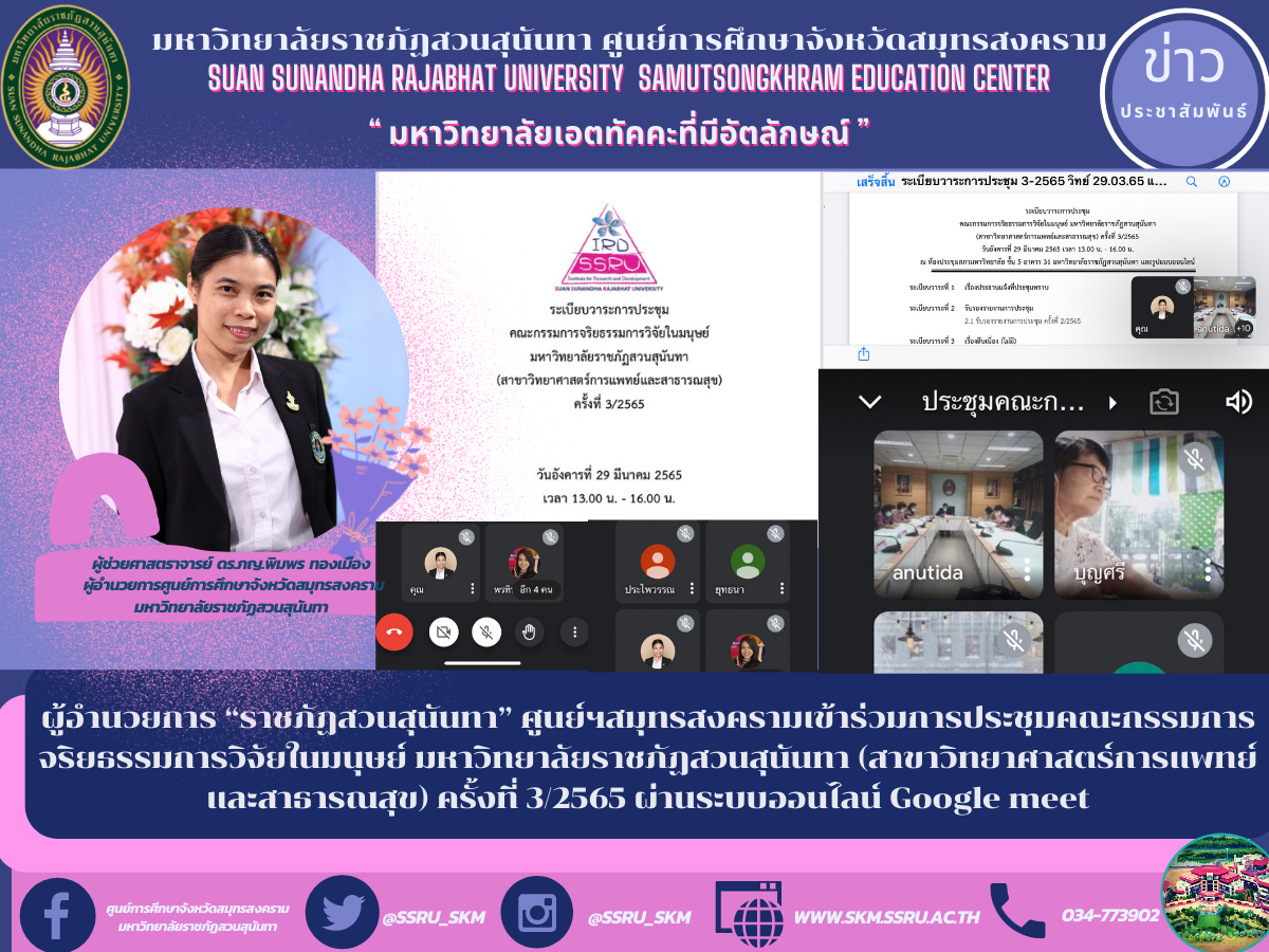 (29 มี.ค. 65) เวลา 13.30 น. ผู้ช่วยศาสตราจารย์ ดร.ภญ.พิมพร ทองเมือง ผู้อำนวยการศูนย์การศึกษาจังหวัดสมุทรสงคราม มหาวิทยาลัยราชภัฏสวนสุนันทา เข้าร่วมการประชุมคณะกรรมการจริยธรรมการวิจัยในมนุษย์ มหาวิทยาลัยราชภัฏสวนสุนันทา (สาขาวิทยาศาสตร์การแพทย์และสาธารณสุข) ครั้งที่ 3/2565 ผ่านระบบออนไลน์ Google meet