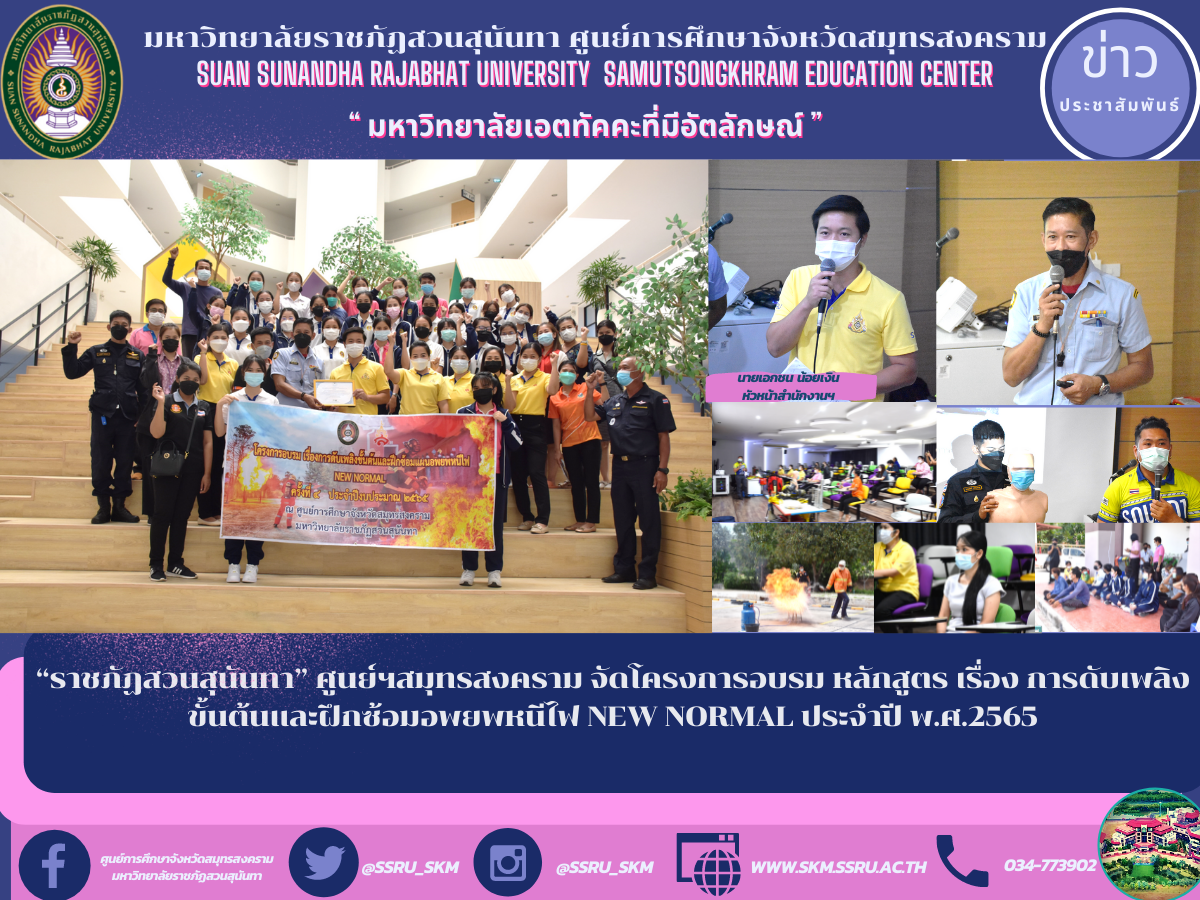 ศูนย์การศึกษาจังหวัดสมุทรสงคราม มหาวิทยาลัยราชภัฏสวนสุนันทา เตรียมพร้อมรับมืออัคคีภัย ร่วมกับเทศบาลเมืองจังหวัดสมุทรสงคราม จัดโครงการอบรม หลักสูตร เรื่อง การดับเพลิงขั้นต้นและฝึกซ้อมอพยพหนีไฟ NEW NORMAL ประจำปี พ.ศ.2565 ให้แก่ คณาจารย์,บุคลากร, นักศึกษา เพื่อเตรียมรับมือกับอุบัติเหตุที่เกิดขึ้นในอนาคตและให้เรียนรู้ประสบการณ์ จากเหตุการณ์จำลองหากเจอสถานการณ์จริง ในวันที่ 29 มี.ค.65 โดยมีนายเอกชน น้อยเงิน หัวหน้าสำนักงานฯ เป็นประธานกล่าวเปิดโครงการฯ พร้อมกล่าวถึงวัตุประสงค์การจัดงาน ณ อาคารปฏิบัติการฟื้นฟูสุขภาพ พร้อมสร้างความตื่นตัวในการป้องกันเหตุไฟไหม้ ให้ความรู้เกี่ยวกับข้อควรปฏิบัติเมื่อเกิดอัคคีภัยได้อย่างถูกต้อง รวมถึงสาธิตการดับเพลิงด้วยอุปกรณ์และวิธีการต่างๆ ซึ่งรับเกียรติจาก คณะครูฝึกงานป้องกันและบรรเทาสาธารณภัยจากเทศบาลเมืองสมุทรสงคราม ได้บรรยายและฝึกปฏิบัติดังนี้