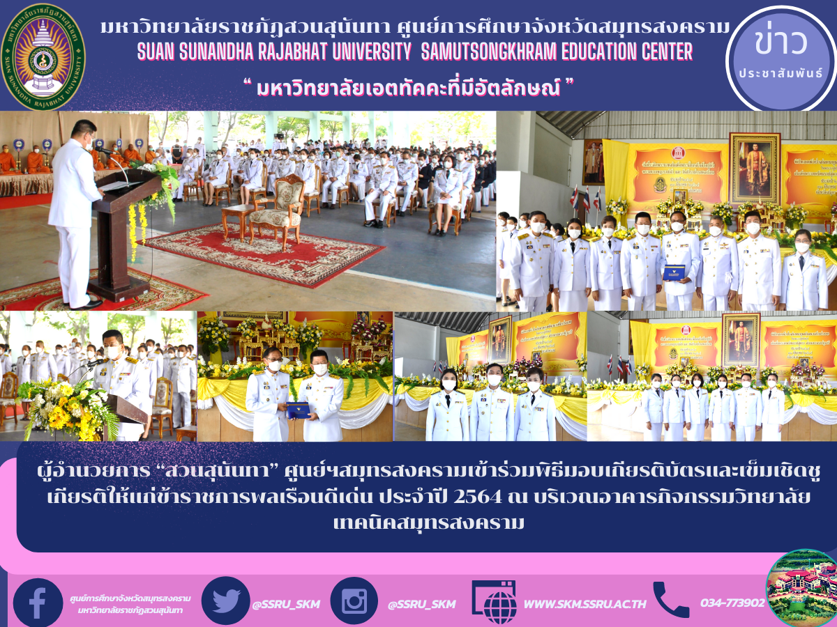 วันนี้ (31 มีนาคม 2565) ผู้ช่วยศาสตราจารย์ ดร.ภญ.พิมพร ทองเมือง ผู้อำนวยการศูนย์การศึกษาจังหวัดสมุทรสงคราม มหาวิทยาลัยราชภัฏสวนสุนันทา เข้าร่วมพิธีมอบเกียรติบัตรและเข็มเชิดชูเกียรติให้แก่ข้าราชการพลเรือนดีเด่น ประจำปี 2564 โดยมีนายขจร ศรีชวโนทัย ผู้ว่าราชการจังหวัดสมุทรสงคราม เป็นประธานในพิธีวันข้าราชการพลเรือน อ่านสารพลเอกประยุทธ จันทร์โอชา นายกรัฐมนตรี และเป็นประธานพร้อมมอบเกียรติบัตรและเข็มเชิดชูเกียรติให้แก่ข้าราชการพลเรือนดีเด่น ประจำปี 2564โดยมีนายสันชัย พัฒนะวิชัย หัวหน้าสำนักงานจังหวัดสมุทรสงคราม กล่าวรายงานวัตถุประสงค์ ของการจัดงานวันข้าราชการพลเรือน วันที่ 1 เมษายนของทุกปี กระทรวงศึกษาธิการได้มอบหมายให้จังหวัดพิจารณาคัดเลือกข้าราชการสังกัดส่วนภูมิภาค บุคลากรทางการศึกษา ข้าราชการตำรวจ และลูกจ้างประจำที่ปฎิบัติหน้าที่ในจังหวัด เป็นข้าราชการพลเรือนดีเด่น ประจำปี 2564 จังหวัดสมุทรสงครามมีข้าราชการได้รับการคัดเลือกจำนวน 9 ราย โดยคณะกรรมการคัดเลือกข้าราชการพลเรือนดีเด่นจังหวัดสมุทรสงคราม ได้คัดเลือกพลเรือนดีเด่น ประจำปี 2564 จำนวน 3 ราย ได้แก่ 1.นายวุฒิชัย ยามโคกสูง นายอำเภอบางคนที 2. นายแพทย์เดชา มีสุข ผู้อำนวยการโรงพยาบาลนภาลัย และ 3.นางสาวสุนีย์ ทองประเจียด นักวิชาการคลังชำนาญการพิเศษ และได้มอบเกียรติบัตรแก่ผู้ที่ได้รับการเสนอชื่อและผลงานเพื่อคัดเลือกเป็นข้าราชการพลเรือนดีเด่น ในจังหวัดสมุทรสงคราม ประจำปี 2564 จำนวน 6 ราย ณ บริเวณอาคารกิจกรรมวิทยาลัยเทคนิคสมุทรสงคราม