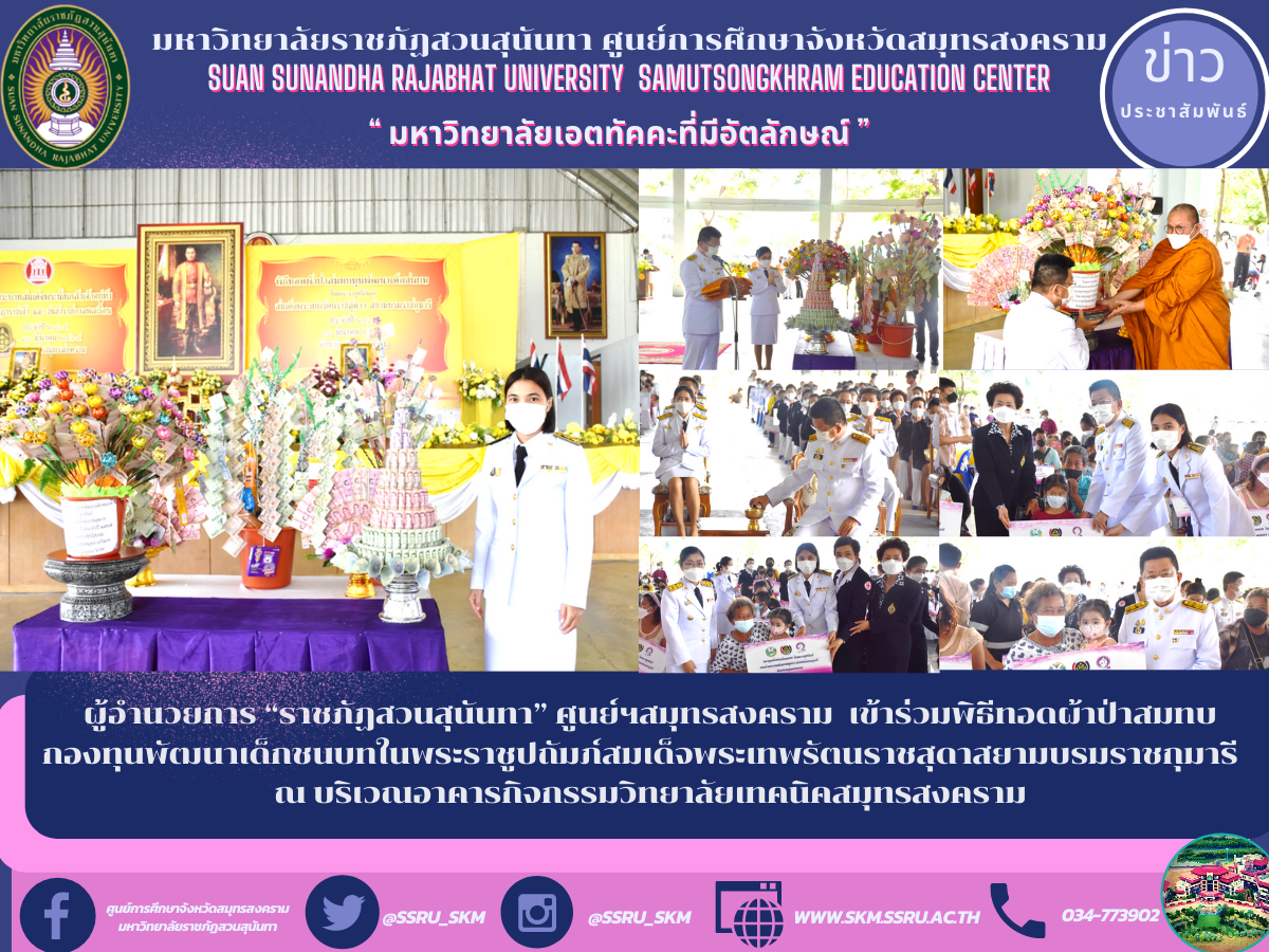 ผู้อำนวยการ “ราชภัฏสวนสุนันทา” ศูนย์ฯสมุทรสงคราม เข้าร่วมพิธีทอดผ้าป่าสมทบกองทุนพัฒนาเด็กชนบทในพระราชูปถัมภ์สมเด็จพระเทพรัตนราชสุดาสยามบรมราชกุมารี ณ บริเวณอาคารกิจกรรมวิทยาลัยเทคนิคสมุทรสงคราม