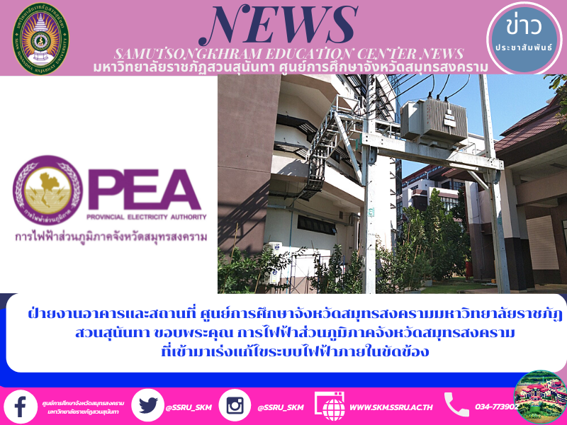 ฝ่ายงานอาคารและสถานที่ ศูนย์การศึกษาจังหวัดสมุทรสงคราม มหาวิทยาลัยราชภัฏสวนสุนันทา ขอบพระคุณ การไฟฟ้าส่วนภูมิภาคจังหวัดสมุทรสงคราม