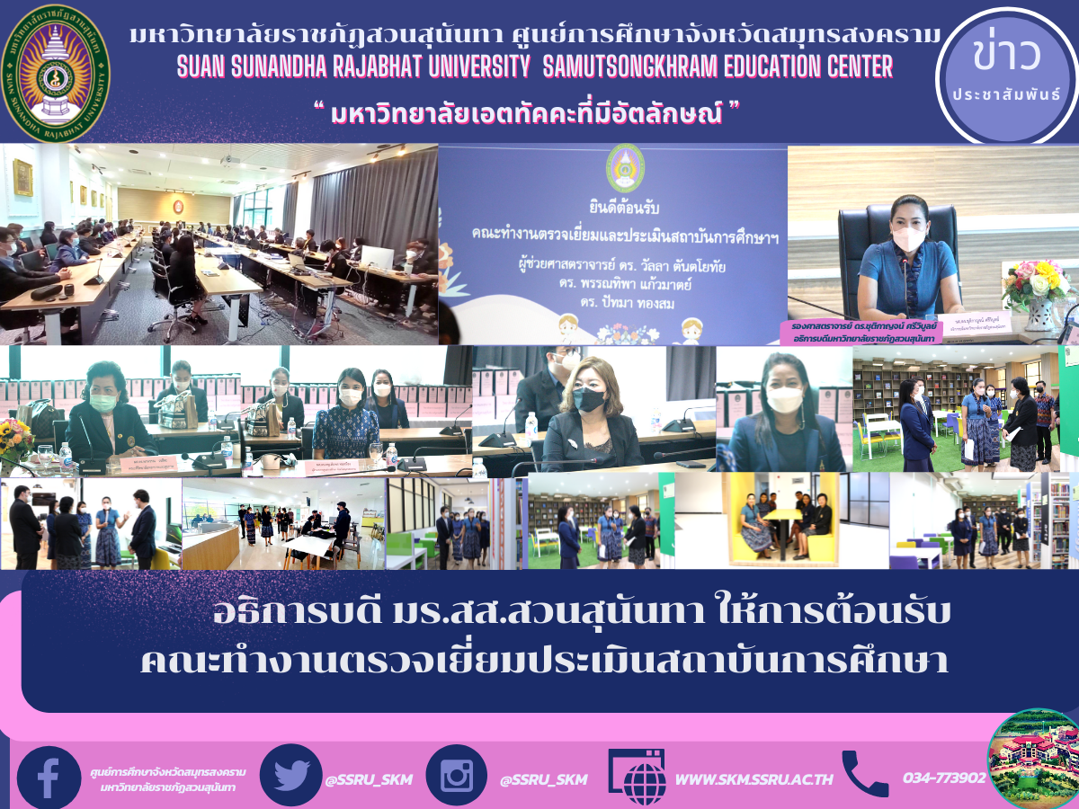 (27 เม.ย. 65) เวลา 09.00 น. รองศาสตราจารย์ ดร.ชุติกาญจน์ ศรีวิบูลย์ อธิการบดีมหาวิทยาลัยราชภัฏสวนสุนันทา พร้อมด้วย ผู้ช่วยศาสตราจารย์ ดร.ภญ.พิมพร ทองเมือง ผู้อำนวยการศูนย์การศึกษาจังหวัดสมุทรสงคราม ,ผู้ช่วยศาสตราจารย์ ดร.พรพรรณ วรสีหะ คณบดีวิทยาลัยพยาบาลและสุขภาพ ,ผู้ช่วยศาสตราจารย์ ดร.สุจิตรา อู่รัตนมณี ผู้อำนวยการ สถาบันส่งเสริมและพัฒนาสุขภาพสังคมสูงวัย และคณะผู้บริหาร ให้การต้อนรับคณะทำงานตรวจเยี่ยมประเมินสถาบันการศึกษา โดยวิทยาลัยพยาบาลและสุขภาพเป็นผู้ดำเนินการให้ตรวจเยี่ยมฯ ณ ห้องประชุมทองจักรี (๖๕ ที่นั่ง) อาคารปฏิบัติการฟื้นฟูสุขภาพ