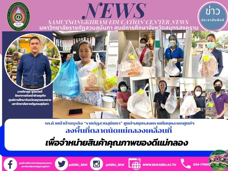 รก.หัวหน้าฝ่ายธุรกิจ “ราชภัฏสวนสุนันทา” ศูนย์ฯสมุทรสงครามทีมบุคลากรศูนย์ฯลงพื้นที่ตลาดนัดแม่กลองเคลื่อนที่ เพื่อจำหน่ายสินค้าคุณภาพของดีขึ้นชื่อลือชา เมืองแม่กลอง อาทิเช่น ปลาทูนึ่งแม่กลอง,กระปิเคยตาดำ,ไข่ไก่,ชะคราม,น้ำตาลมะพร้าว,คุกกี้ถั่วรูปปลาทู และสินค้าอื่นๆอีกหลายรายการรับออเดอร์ต่อเนื่อง บริการนำส่งความอร่อยทุกท่าน