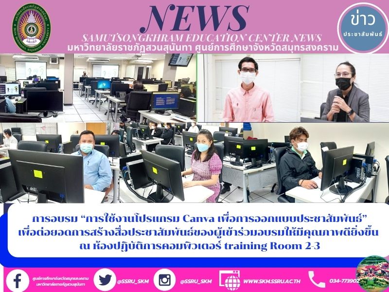 วันที่ 12 มกราคม 2565 เวลา 13.00 น. ผู้ช่วยศาสตร์จารย์ ดร.ภญ.พิมพร ทองเมือง ผู้อำนวยการศูนย์การศึกษาจังหวัดสมุทรสงคราม มหาวิทยาลัยราชภัฏสวนสุนันทา มอบหมายให้ นายวุฒิไกร ประวัติพงษ์ เจ้าหน้าที่บริหารงานบุคลากร ,นางสาวชญาณิศา วรรณา นักประชาสัมพันธ์ และนายสถิ ระนกอินทรีย์ เจ้าหน้าที่บริหารงานทั่วไป เข้าร่วมการอบรม “การใช้งานโปรแกรม Canva เพื่อการออกแบบประชาสัมพันธ์” เพื่อต่อยอดการสร้างสื่อประชาสัมพันธ์ของผู้เข้าร่วมอบรมให้มีคุณภาพดียิ่งขึ้น ณ ห้องปฏิบัติการคอมพิวเตอร์ training Room 2-3 ซึ่งจัดขึ้นโดย สำนักวิทยบริการและเทคโนโลยีสารสนเทศ โดย อาจารย์อภิรักษ์ ธิตินฤมิต รองผู้อำนวยการศูนย์เทคโนโลยีสารสนเทศ เป็นประธานกล่าวเปิดฯ และได้รับเกียรติจาก ผู้ช่วยศาสตราจารย์ ดร.ขวัญใจ สุขก้อน อาจารย์ประจำสาขาวิชาการออกแบบกราฟิกและมัลติมิเดีย คณะเทคโนโลยีอุตสาหกรรม เป็นวิทยากรในการอบรม