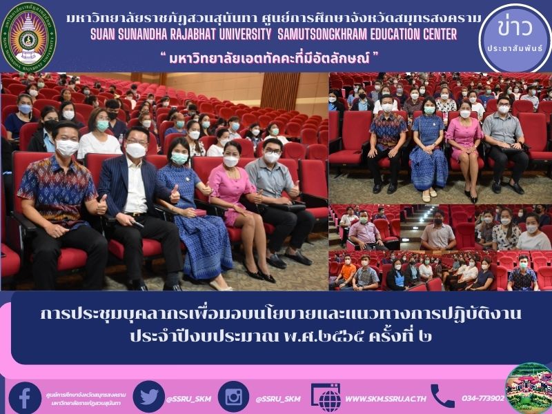 วันศุกร์ ๘ กรกฎาคม ๒๕๖๕ เวลา ๐๘.๓๐-๑๒.๐๐ น.ศูนย์การศึกษาจังหวัดสมุทรสงคราม มหาวิทยาลัยราชภัฏสวนสุนันทา โดยผู้ช่วยศาสตราจารย์ ดร.ภญ.พิมพร ทองเมือง ผู้อำนวยการศูนย์การศึกษาจังหวัดสมุทรสงคราม มหาวิทยาลัยราชภัฏสวนสุนันทา พร้อมด้วย นายเอกชน น้อยเงิน หัวหน้าสำนักงานและบุคลากรศูนย์ฯสายสนับสนุนวิชาการ เข้าร่วมประชุมมอบนโยบายบุคลกรมหาวิทยาลัยราชภัฏสวนสุนันทา ครั้งที่ ๒ เพื่อรับฟังและรับทราบนโยบาย แนวทางการปฏิบัติงานเพื่อขับเคลื่อนมหาวิทยาลัย แผนงานที่สำคัญ และกระบวนการปฏิบัติงานของบุคลากร ประจำปีงบประมาณ พ.ศ.๒๕๖๕ ผ่าน Video Conference ณ หอประชุมเบญจศิลาดล (๕๐๐ ที่นั่ง) โดยมีรองศาสตราจารย์ ดร.ชุติกาญจน์ ศรีวิบูลย์ อธิการบดีมหาวิทยาลัยราชภัฏสวนสุนันทา เป็นประธานเปิดการประชุมและมอบนโยบายสู่การปฏิบัติ เรื่อง ทำอย่างไรถึงทำงานได้เต็มประสิทธิภาพ,การ UPDATE ข้อมูลอย่างสม่ำเสมอ,ภาษาที่ใช้ในช่องทางสื่อ,จิตสำนึกรักองค์กรและการสร้างภาพลักษณ์ที่ดีให้กับองค์กร จากนั้นเป็นการมอบนโยบายจากผู้บริหารในหัวข้อต่างๆ โดย รศ.ดร.วิทยา เมฆขำ รองอธิการบดีฝ่ายแผนงานและประกันคุณภาพ บรรยายเรื่อง แบบประเมินผลการปฏิบัติราชการและการจัดอันดับมหาวิทยาลัย