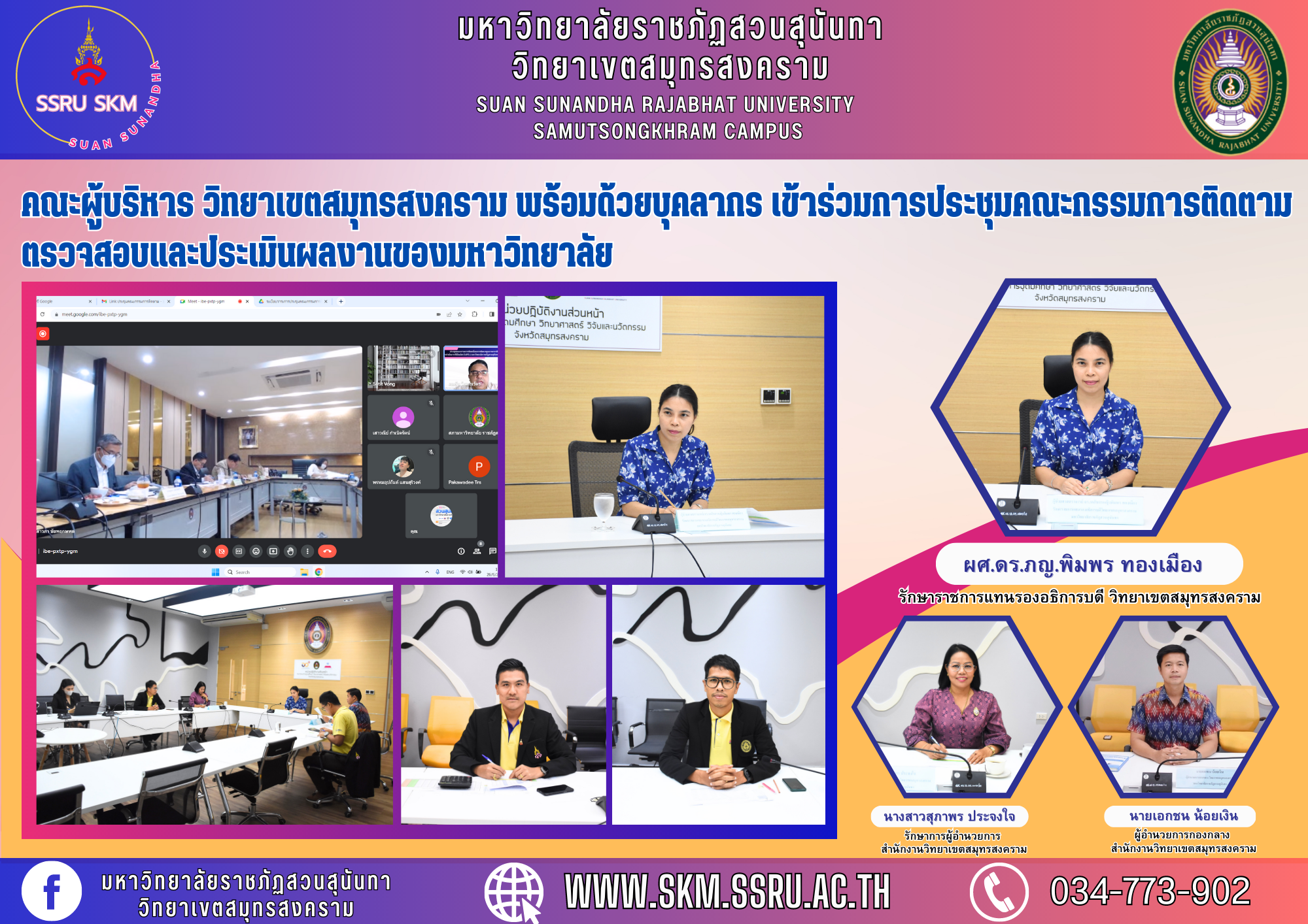 วันจันทร์ที่ 26 มิถุนายน 2566 ผศ.ดร.ภญ.พิมพร ทองเมือง รักษาราชการแทนรองอธิการบดี วิทยาเขตสมุทรสงคราม มหาวิทยาลัยราชภัฏสวนสุนัน เข้าร่วมชี้แจงผลการดำเนินงานการจัดหารายได้ ประจำปีงบประมาณ พ.ศ.2566 ต่อคณะกรรมการติดตาม ตรวจสอบและประเมินผลงานของมหาวิทยาลัย พร้อมด้วยนางสาวสุภาพร ประจงใจ รักษาการผู้อำนวยการ สำนักงานวิทยาเขตสมุทรสงคราม ,นายเอกชน น้อยเงิน ผู้อำนวยการกองกลาง สำนักงานวิทยาเขตสมุทรสงคราม และนายจิรายุส พูลสวัสดิ์ เจ้าหน้าที่บริหารงานทั่วไป ฝ่ายทรัพย์สินและรายได้ , นายจำรัส นิ่มสำราญ บุคลากรกองนโยบายและแผน สำนักงานวิทยาเขตสมุทรสงคราม เข้าร่วมประชุมในครั้งนี้ ผ่านทางระบบออนไลน์ Google meet ณ ห้องประชุมพรรณพฤกษา ชั้น 5 อาคารผดุงชีวา (วิทยาลัยพยาบาลและสุขภาพ) วิทยาเขตสมุทรสงคราม