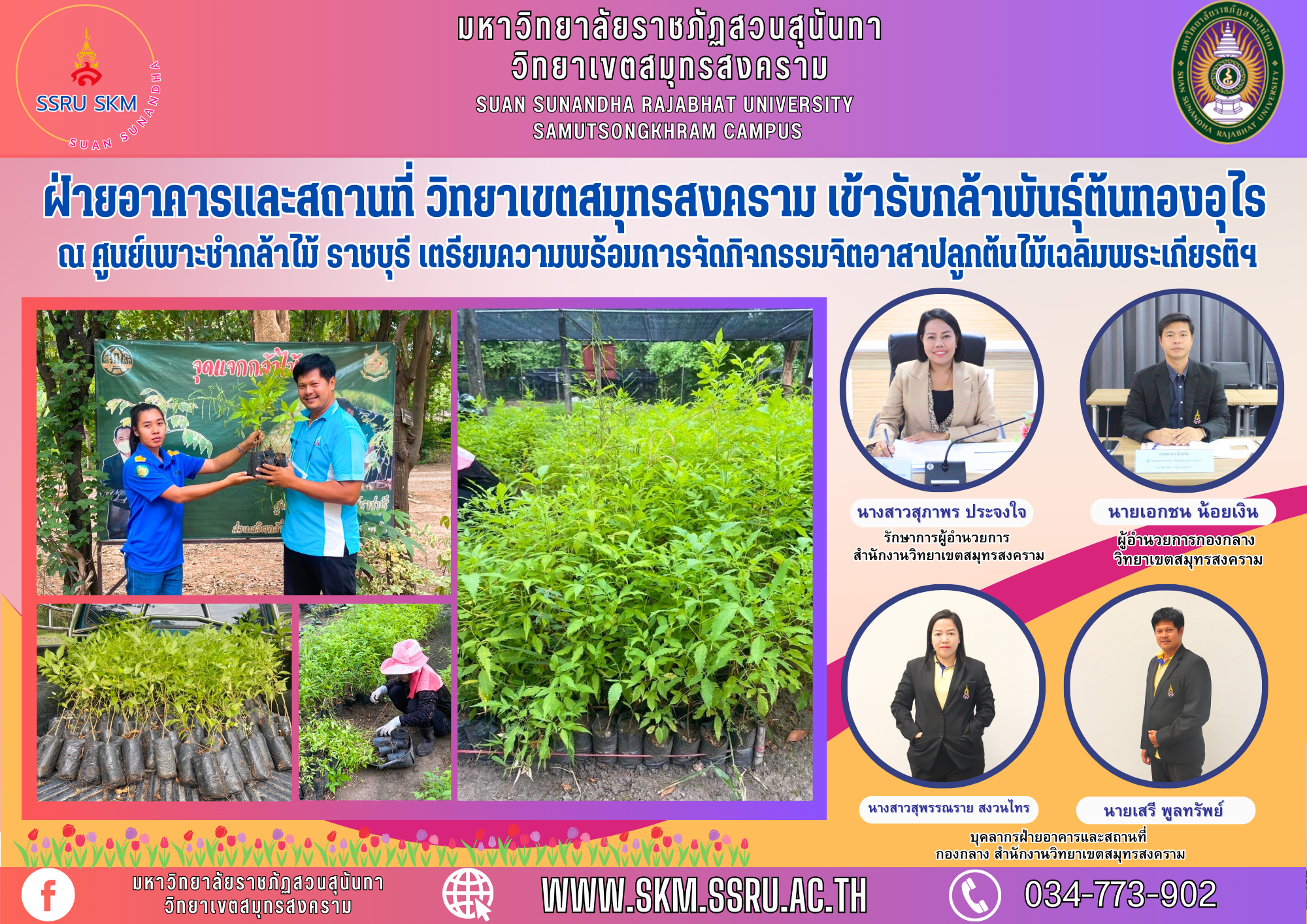 วันที่ 21 กรกฎาคม 2566 นางสาวสุภาพร ประจงใจ รักษาการผู้อำนวยการสำนักงานวิทยาเขตสมุทรสงคราม พร้อมด้วยนายเอกชน น้อยเงิน ผู้อำนวยการกองกลาง สำนักงานวิทยาเขตสมุทรสงคราม มหาวิทยาลัยราชภัฏสวนสุนันทา ได้มอบหมายให้นางสาวสุพรรณราย สงวนไทร และนายเสรี พูลทรัพย์ บุคลากรฝ่ายอาคารและสถานที่ กองกลาง สำนักงานวิทยาเขตสมุทรสงคราม เข้ารับกล้าพันธุ์ต้นทองอุไร เพื่อเตรียมพร้อมการปลูกต้นไม้ ในกิจกรรมจิตอาสาปลูกต้นไม้เฉลิมพระเกียรติ เนื่องในโอกาสวันเฉลิมพระชนมพรรษา พระบาทสมเด็จพระปรเมนทรรามาธิบดีศรีสินทรมหาวชิราลงกรณ พระวชิรเกล้าเจ้าอยู่หัว 28 กรกฎาคม 2566 ซึ่งจะจัดกิจกรรมขึ้น ในวันที่ 27 กรกฎาคม 2566 ณ มหาวิทยาลัยราชภัฏสวนสุนันทา วิทยาเขตสมุทรสงคราม