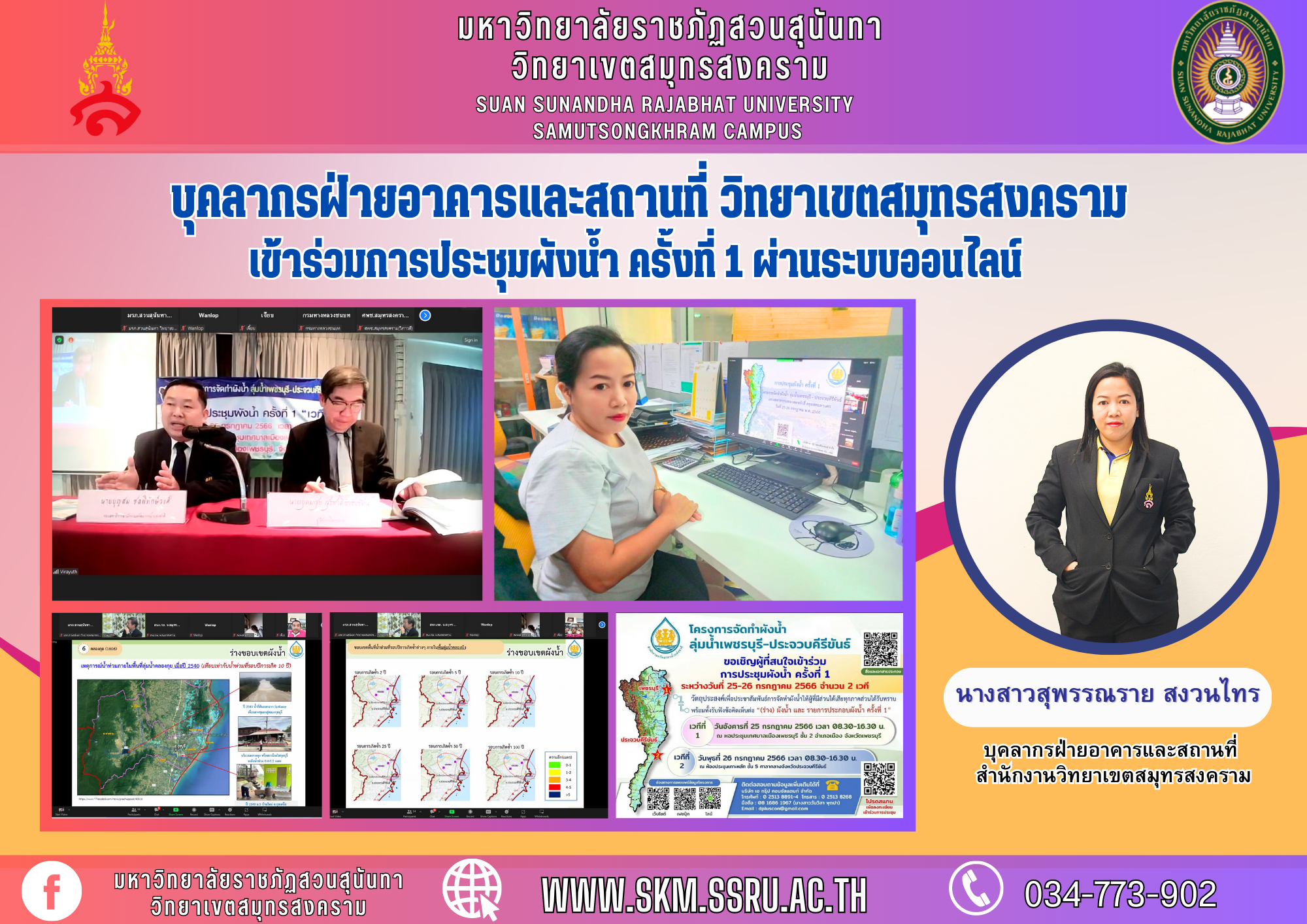 วันที่ 25 กรกฎาคม 2566 ระหว่างเวลา 08.30 -16.30 น. นางสาวสุพรรณราย สงวนไทร บุคลากรฝ่ายอาคารและสถานที่ วิทยาเขตสมุทรสงคราม มหาวิทยาลัยราชภัฏสวนสุนันทา เข้าร่วมการประชุมผังน้ำ ครั้งที่ 1 โครงการจัดทำผังน้ำ ลุ่มน้ำเพชรบุรี – ประจวบคีรีขันธ์ และมีพื้นที่บางส่วนของจังหวัดสมุทรสงคราม เพื่อเป็นการประชาสัมพันธ์การจัดทำผังน้ำ ตลอดจนนำเสนอร่างผังน้ำให้ผู้มีส่วนได้ส่วนเสีย ได้พิจารณาและมีส่วนร่วมในการจัดทำผังน้ำ พร้อมทั้งรับฟังความคิดเห็นและข้อเสนอแนะจากผู้เข้าร่วม เพื่อนำไปพิจารณาประกอบการศึกษาโครงการดังกล่าว โดยเป็นการประชุมผ่านทางระบบออนไลน์