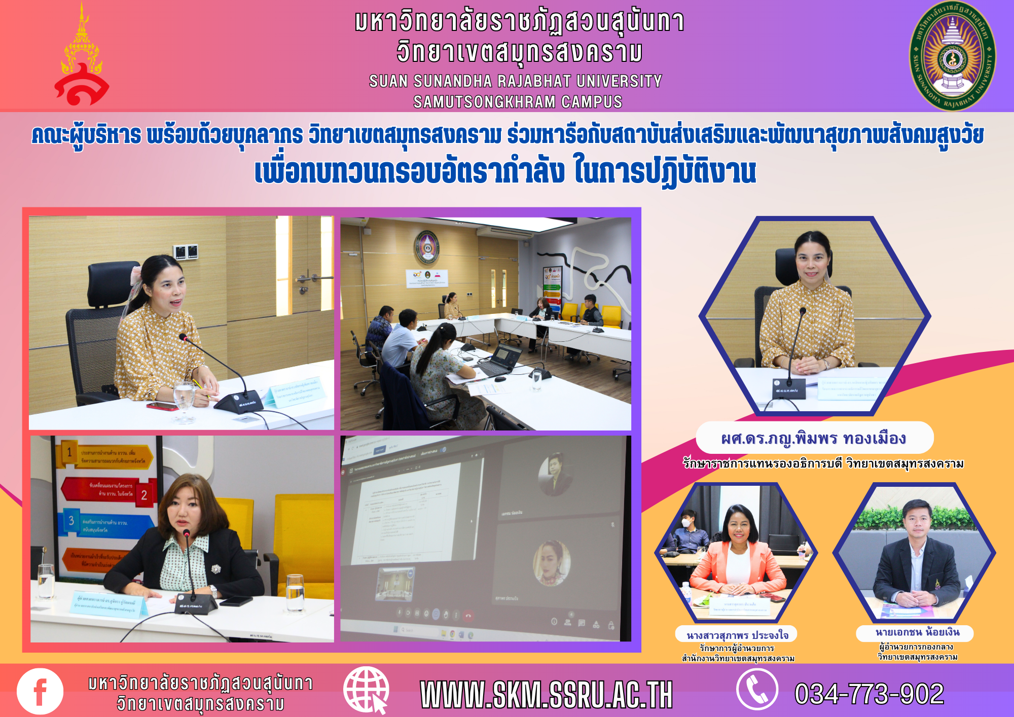 วันที่ 11 สิงหาคม 2566 เวลา 11.00 น. ผู้ช่วยศาสตราจารย์ ดร.เภสัชกรหญิงพิมพร ทองเมือง รักษาราชการแทนรองอธิการบดีวิทยาเขตสมุทรสงคราม พร้อมด้วยนางสาวสุภาพร ประจงใจ รักษาการผู้อำนวยการสำนักงานวิทยาเขตสมุทรสงคราม นายเอกชน น้อยเงิน ผู้อำนวยการกองกลาง สำนักงานวิทยาเขตสมุทรสงคราม นายวุฒิไกร ประวัติพงษ์ เจ้าหน้าที่ฝ่ายบุคคล นายจำรัส นิ่มสำราญ นักวิเคราะห์นโยบายและแผน และนางสาวศรัญญา หนูนาค เจ้าหน้าที่บริหารงานทั่วไป วิทยาเขตสมุทรสงคราม เข้าร่วมประชุมเพื่อทบทวนกรอบอัตรากำลังของสถาบันส่งเสริมและพัฒนาสุขภาพสังคมสูงวัย เพื่อสอดคล้องกับบริบทในการดำเนินงานเพื่อให้เกิดประสิทธิภาพสูงสุด โดยมีผู้ช่วยศาสตราจารย์ ดร.สุจิตรา อู่รัตนมณี ผู้อำนวยการสถาบันส่งเสริมและพัฒนาสุขภาพสังคมสูงวัย มหาวิทยาลัยราชภัฏสวนสุนันทา นำทีมคณะเข้าร่วมหารือ โดยงานประชุมดังกล่าวจัดขึ้น ณ ห้องประชุมพรรณพฤกษา (ห้องประชุมจำนวน 20 ที่นั่ง) ชั้น 5 อาคารวิทยาลัยพยาบาลและสุขภาพ มหาวิทยาลัยราชภัฏสวนสุนันทา วิทยาเขตสมุทรสงคราม