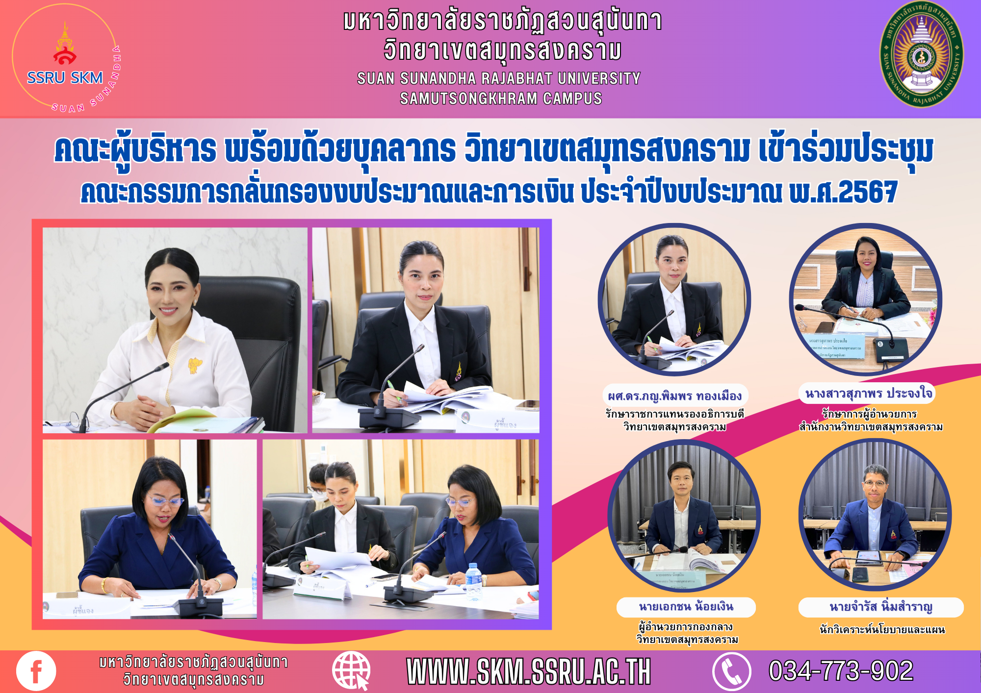 วันที่ 14 สิงหาคม 2566 เวลา 13.00 น. ผู้ช่วยศาสตราจารย์ ดร.เภสัชกรหญิงพิมพร ทองเมือง รักษาราชการแทนรองอธิการบดีวิทยาเขตสมุทรสงคราม พร้อมด้วยนางสาวสุภาพร ประจงใจ รักษาการผู้อำนวยการสำนักงานวิทยาเขตสมุทรสงคราม นายเอกชน น้อยเงิน ผู้อำนวยการกองกลาง สำนักงานวิทยาเขตสมุทรสงคราม และนายจำรัส นิ่มสำราญ นักวิเคราะห์นโยบายและแผน วิทยาเขตสมุทรสงคราม เข้าร่วมประชุมคณะกรรมการกลั่นกรองงบประมาณและการเงิน ประจำปีงบประมาณ พ.ศ. 2567 โดยมีรองศาสตราจารย์ ดร.ชุติกาญจน์ ศรีวิบูลย์ อธิการบดีมหาวิทยาลัยราชภัฏสวนสุนันทา เป็นประธานในการประชุม เพื่อการพิจารณาการจัดทำแผนฝ่ายธุรกิจมหาวิทยาลัยราชภัฏสวนสุนันทา ประจำปีงบประมาณ พ.ศ. 2567 - 2571 ที่ประชุมมีการพิจารณาแผนบริหารธุรกิจและแนวทางการจัดหารายได้ ประมาณการ รายรับ - รายจ่าย ของวิทยาเขตสมุทรสงคราม ประจำปีงบประมาณ พ.ศ. 2567