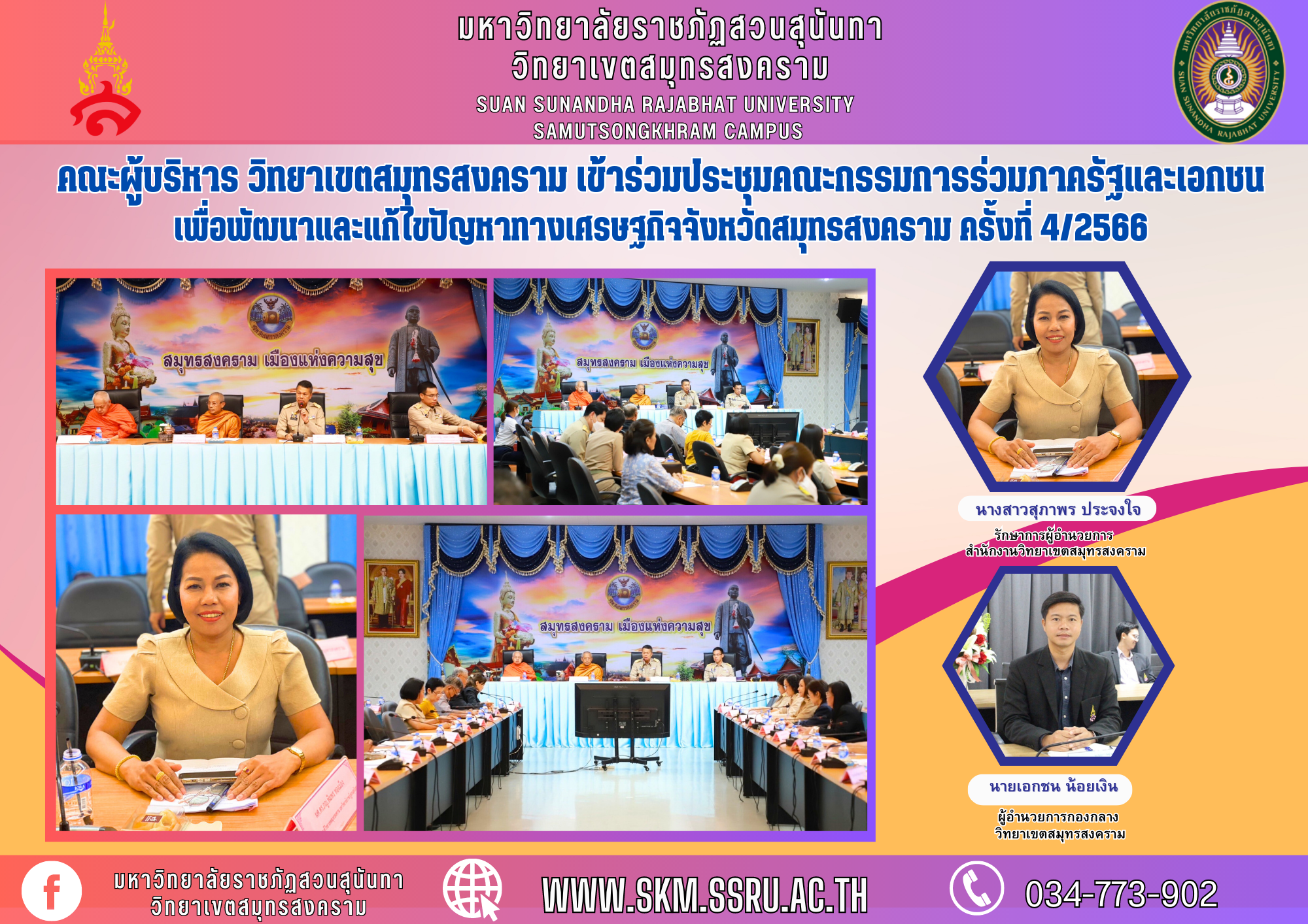 วันที่ 21 สิงหาคม 2566 เวลา 13.30 น. นางสาวสุภาพร ประจงใจ รักษาการผู้อำนวยการสำนักงานวิทยาเขตสมุทรสงคราม พร้อมด้วยนายเอกชน น้อยเงิน ผู้อำนวยการกองกลาง สำนักงานวิทยาเขตสมุทรสงคราม มหาวิทยาลัยราชภัฏสวนสุนันทา เข้าร่วมประชุมคณะกรรมการร่วมภาครัฐและเอกชน เพื่อพัฒนาและแก้ไขปัญหาทางเศรษฐกิจจังหวัดสมุทรสงคราม ครั้งที่ 4/2566 โดยมีวัตถุประสงค์เพื่อให้การดำเนินงานของคณะกรรมการร่วมภาครัฐและเอกชน สามารถพัฒนาและแก้ไขปัญหาทางเศรษฐกิจจังหวัดสมุทรสงคราม เป็นไปด้วยความเรียบร้อยและมีประสิทธิภาพ โดยมีนายสมนึก พรหมเขียว ผู้ว่าราชการจังหวัดสมุทรสงคราม เป็นประธานในการประชุม