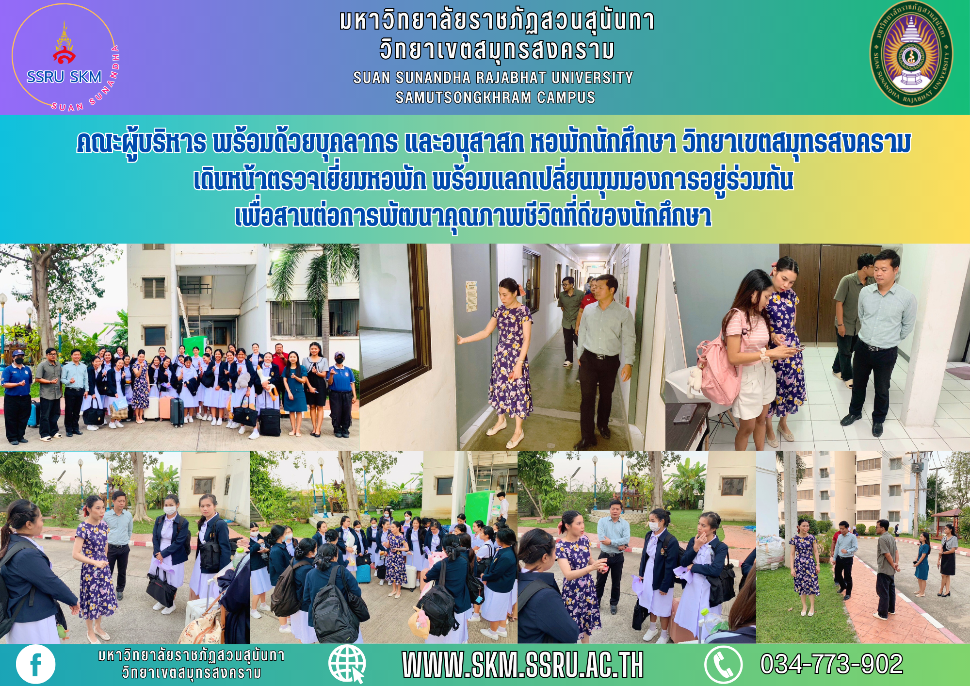 มหาวิทยาลัยราชภัฏสวนสุนันทา วิทยาเขตสมุทรสงคราม นำโดย ผู้ช่วยศาสตราจารย์ ดร. เภสัชกรหญิงพิมพร ทองเมือง รองอธิการบดีวิทยาเขตสมุทรสงคราม พร้อมด้วยนายเอกชน น้อยเงิน ผู้อำนวยการกองกลาง สำนักงานวิทยาเขตสมุทรสงคราม,บุคลากร หน่วยธุรกิจหอพักนักศึกษา ฝ่ายทรัพย์สินและรายได้ ได้แก่ นางสาวอรวรรณ วุทธิโช นักวิเคราะห์นโยบายและแผน, นางสาวกรรณิกา สีสุวรรณ์ เจ้าหน้าที่บริหารงานทั่วไป, นายพงษ์พร เผ่าจันทร์ ช่างเทคนิค และอนุสาสก ประจำหอพักนักศึกษา ได้แก่ นายวุฒิไกร ประวัติพงษ์ เจ้าหน้าที่ฝ่ายบุคคล และนายชัยวัฒน์ ทูคำมี รักษาการหัวหน้าฝ่ายพัสดุ วิทยาเขตสมุทรสงคราม ได้จัดกิจกรรมการตรวจเยี่ยมหอพักนักศึกษาในทุกอาคาร ด้วยเล็งเห็นว่าหอพักนักศึกษาเป็นสถานที่เปิดโอกาสให้นักศึกษาได้รู้จักใช้ชีวิตอยู่ร่วมกับบุคคลอื่นในสังคม สามารถแลกเปลี่ยนทัศนคติ ฝึกให้นักศึกษาได้ดูแลตนเอง ช่วยเหลือบุคคลอื่น จึงได้จัดกิจกรรมการตรวจเยี่ยมหอพักนักศึกษาขึ้นเป็นประจำ เพื่อให้ความช่วยเหลือและดูแลความเป็นอยู่ของนักศึกษา ควบคุมดูแล และป้องกันปัญหาต่างๆที่จะส่งผลกระทบต่อความเป็นอยู่ของนักศึกษา สร้างความอบอุ่นใจให้กับนักศึกษาและผู้ปกครอง เพราะเราตั้งใจจะดูแลนักศึกษาให้เสมือนหนึ่งคนในครอบครัว โดยกิจกรรมการตรวจเยี่ยมหอพักนักศึกษาดังกล่าว จัดขึ้นในวันที่ 17 มกราคม 2567 เวลา 17.00 น. ณ หอพักนักศึกษา มหาวิทยาลัยราชภัฏสวนสุนันทา วิทยาเขตสมุทรสงคราม