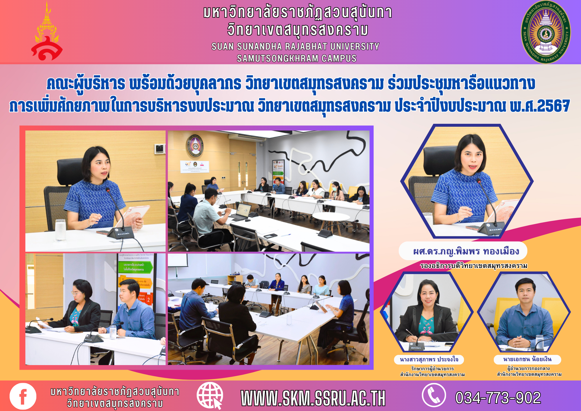 วันที่ 31 มกราคม 2567 เวลา 10.30 น. ผู้ช่วยศาสตราจารย์ ดร. เภสัชกรหญิงพิมพร ทองเมือง รองอธิการบดีวิทยาเขตสมุทรสงคราม พร้อมด้วยนางสาวสุภาพร ประจงใจ รักษาการผู้อำนวยการสำนักงานวิทยาเขตสมุทรสงคราม,นายเอกชน น้อยเงิน ผู้อำนวยการกองกลาง สำนักงานวิทยาเขตสมุทรสงคราม และบุคลากร วิทยาเขตสมุทรสงครามในส่วนงานต่างๆ ได้แก่ กองนโยบายและแผน ได้แก่ นายจำรัส นิ่มสำราญ นักวิเคราะห์นโยบายและแผน,นางสาวจุฑารัตน์ จันต่าย นักวิเคราะห์นโยบายและแผน กองคลัง ได้แก่ นางสาวบุปผา มุ่งใฝ่ดี รักษาการหัวหน้าฝ่ายการเงิน,นางสาวภัคนิษฐ์กา จันทร์จิราวัฒน์ นักวิชาการเงินและบัญชี,นางสาวชารินา ฮกฮวกชิ้ม นักวิชาการเงินและบัญชี กองกลาง ในส่วนงานของฝ่ายทรัพย์สินและรายได้ ได้แก่ นายจิรายุส พูลสวัสดิ์ เจ้าหน้าที่บริหารงานทั่วไป,นางสาวอภิญญา มุกดาธนพงศ์ เจ้าหน้าที่บริหารงานทั่วไป,นางสาวอรวรรณ วุทธิโช นักวิเคราะห์นโยบายและแผน และนางสาวกรรณิกา ลีสุวรรณ์ เจ้าหน้าที่บริหารงานทั่วไป เข้าร่วมการประชุมหารือแนวทางเพื่อเพิ่มศักยภาพในการบริหารงบประมาณ วิทยาเขตสมุทรสงคราม ประจำปีงบประมาณ พ.ศ.2567 ให้มีประสิทธิภาพมากยิ่งขึ้น