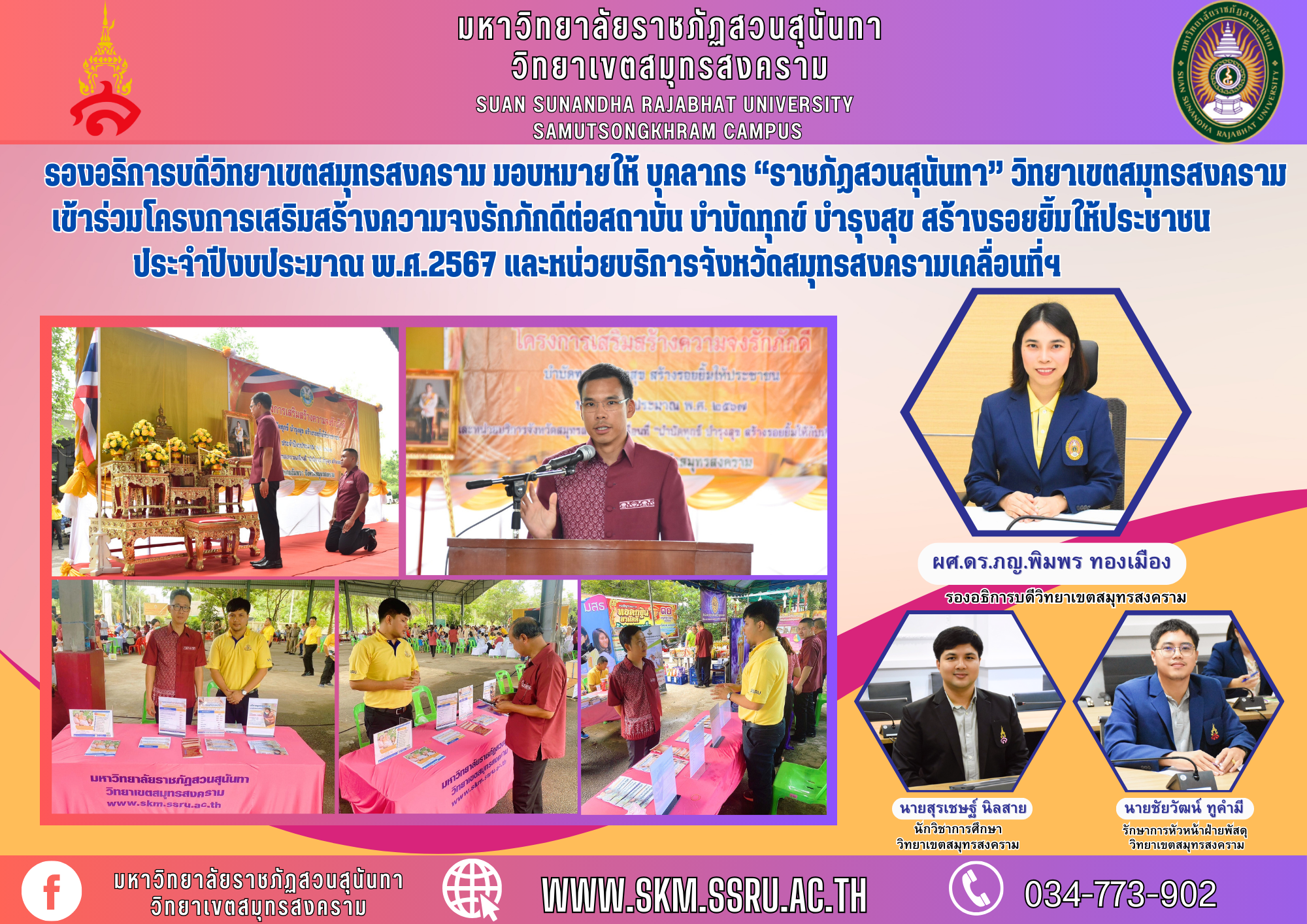 วันที่ 10 กรกฎาคม 2567 ผู้ช่วยศาสตราจารย์ ดร.เภสัชกรหญิงพิมพร ทองเมือง รองอธิการบดีวิทยาเขตสมุทรสงคราม ได้มอบหมายให้ นายสุรเชษฐ์ นิลสาย นักวิชาการศึกษา และนายชัยวัฒน์ ทูคำมี รักษาการหัวหน้าฝ่ายพัสดุ สำนักงานวิทยาเขตสมุทรสงคราม มหาวิทยาลัยราชภัฏสวนสุนันทา เข้าร่วมโครงการเสริมสร้างความจงรักภักดีต่อสถาบัน บำบัดทุกข์ บำรุงสุข สร้างรอยยิ้มให้ประชาชน ประจำปีงบประมาณ พ.ศ.2567 และหน่วยบริการจังหวัดสมุทรสงครามเคลื่อนที่ "บำบัดทุกข์ บำรุงสุข สร้างรอยยิ้มให้ประชาชน" (ครั้งที่ 9) โดยทางมหาวิทยาลัยราชภัฏสวนสุนันทา วิทยาเขตสมุทรสงคราม ได้มีการออกบูธประชาสัมพันธ์ภาพรวมในการให้บริการ ของทางมหาวิทยาลัยราชภัฏสวนสุนันทา และความรู้ด้านอื่นๆ ให้แก่ประชาชน ผู้ที่สนใจเข้าเยี่ยมชมบูธนิทรรศการ