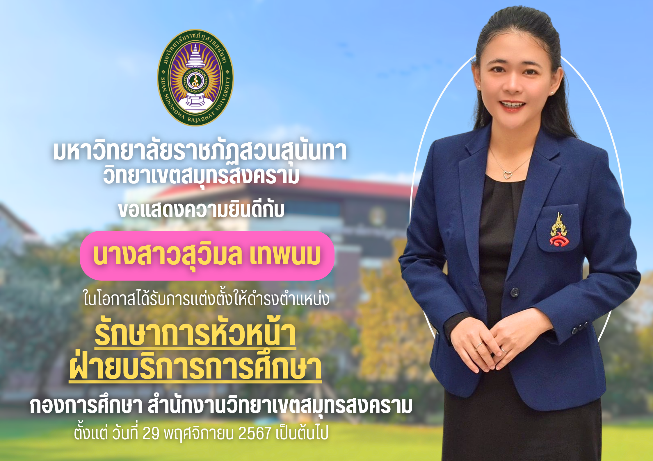 มหาวิทยาลัยราชภัฏสวนสุนันทา วิทยาเขตสมุทรสงคราม ขอแสดงความยินดีกับนางสาวสุวิมล เทพนม ในโอกาสได้รับการแต่งตั้งให้ดำรงตำแหน่งรักษาการหัวหน้าฝ่ายบริการการศึกษา กองการศึกษา สำนักงานวิทยาเขตสมุทรสงคราม ตั้งแต่วันที่ 29 พฤศจิกายน 2567 เป็นต้นไป
