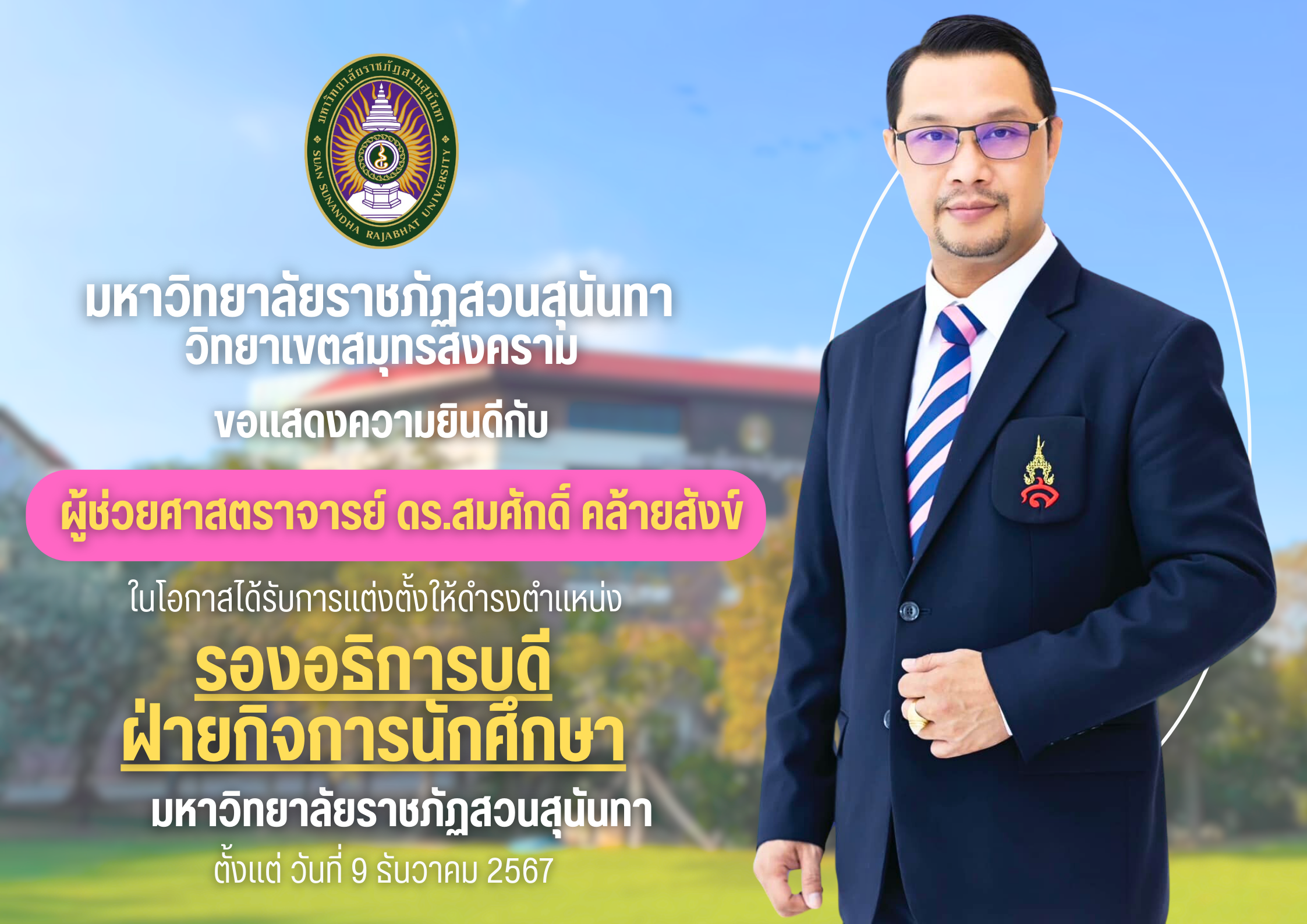มหาวิทยาลัยราชภัฏสวนสุนันทา วิทยาเขตสมุทรสงคราม ขอแสดงความยินดีกับผู้ช่วยศาสตราจารย์ ดร.สมศักดิ์ คล้ายสังข์ ในโอกาสได้รับการแต่งตั้งให้ดำรงตำแหน่งรองอธิการบดีฝ่ายกิจการนักศึกษา มหาวิทยาลัยราชภัฏสวนสุนันทา ตามมติที่ประชุมสภามหาวิทยาลัยราชภัฏสวนสุนันทา วาระพิเศษ ครั้งที่ 2/2567 วันที่ 9 ธันวาคม 2567