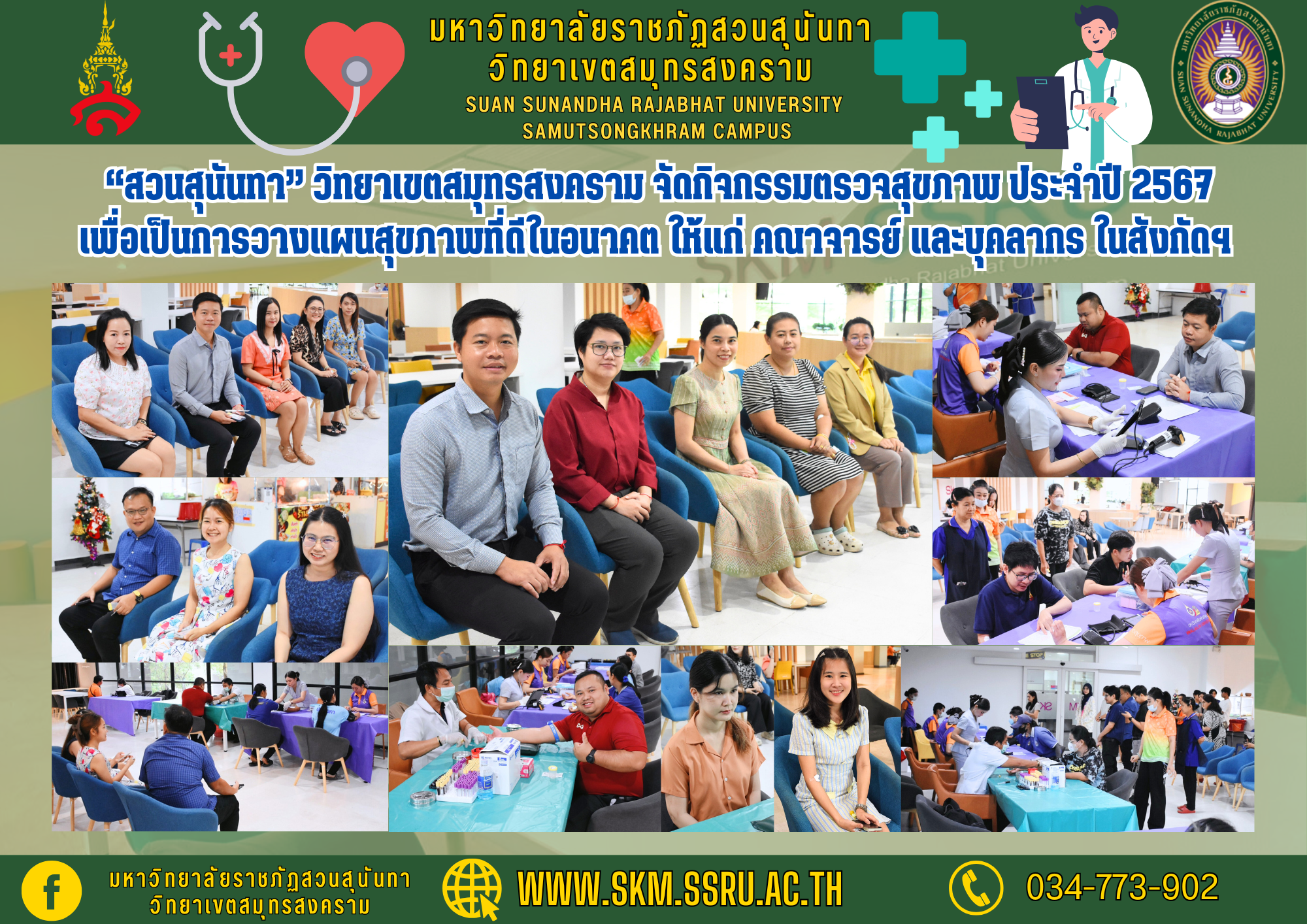 มหาวิทยาลัยราชภัฏสวนสุนันทา วิทยาเขตสมุทรสงคราม จัดกิจกรรมตรวจสุขภาพประจำปี 2567 สำหรับคณาจารย์และบุคลากร เมื่อวันที่ 12 ธันวาคม 2567 ณ โถงชั้น 1 อาคารผดุงชีวา โดยร่วมกับโรงพยาบาลศูนย์การแพทย์ มหาวิทยาลัยวลัยลักษณ์ การตรวจสุขภาพประจำปีเป็นสิ่งสำคัญที่ช่วยตรวจสอบสภาพร่างกายและป้องกันโรค โดยเฉพาะกลุ่มที่มีอายุ 35 ปีขึ้นไป หรือมีความเสี่ยงจากโรคประจำตัวต่างๆ เช่น เบาหวานและโรคหัวใจ