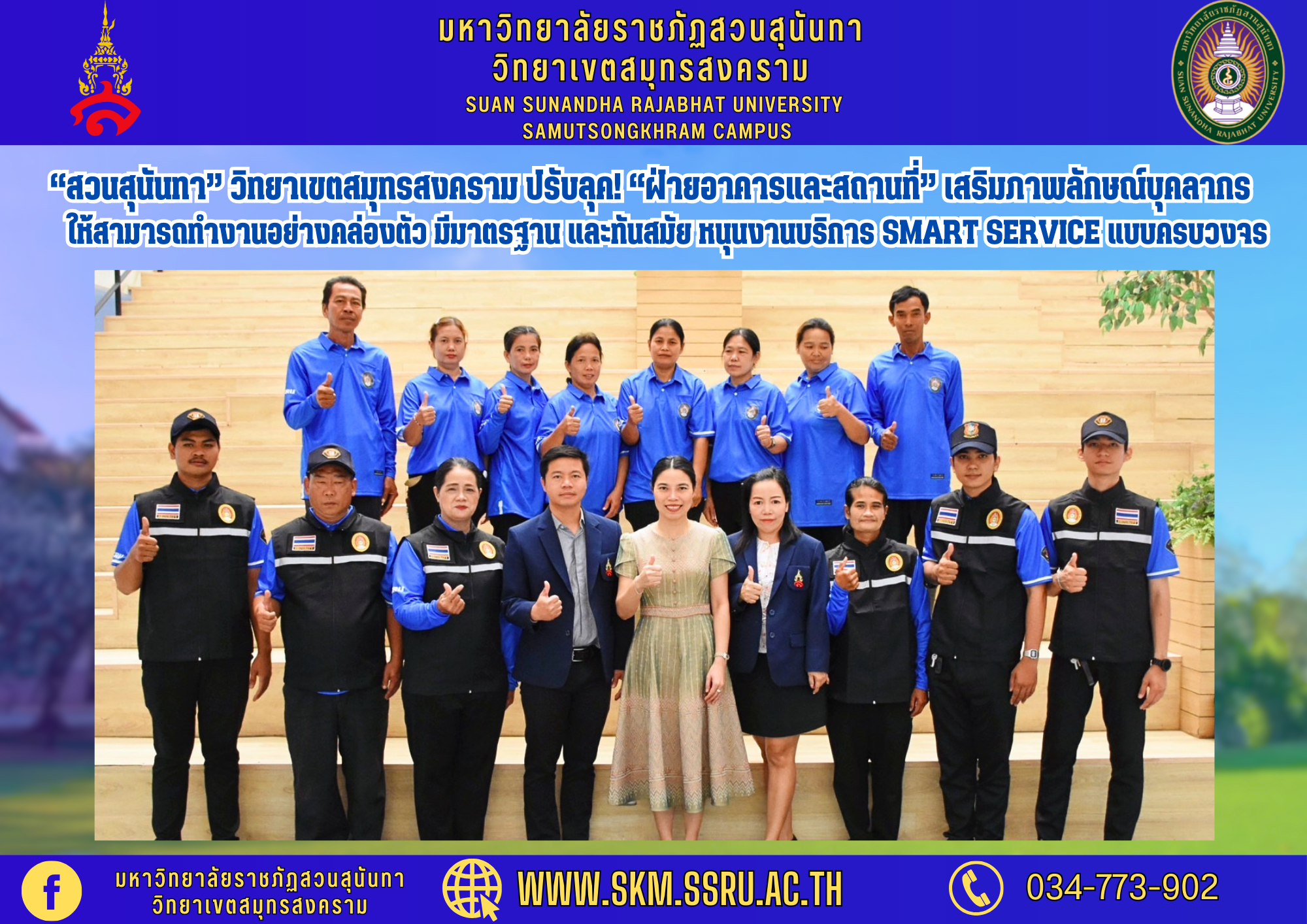 ทั้งส่วนงานแผนกแม่บ้าน แผนกคนสวน และแผนกเจ้าหน้าที่รักษาความปลอดภัย (รปภ.) ปรับภาพลักษณ์การแต่งกายด้วยชุดยูนิฟอร์มที่มีการออกแบบใหม่ เพื่อให้เหมาะสมกับการปฏิบัติหน้าที่ในแต่ละส่วนงาน ให้มีความคล่องตัว มีมาตรฐาน และมีความสวยงาม ทันสมัย เตรียมพร้อมกับการให้บริการในรูปแบบ Smart Service แบบครบวงจร ให้แก่คณาจารย์ บุคลากร นักศึกษา และบุคคลภายนอก ภายในมหาวิทยาลัยราชภัฏสวนสุนันทา วิทยาเขตสมุทรสงคราม