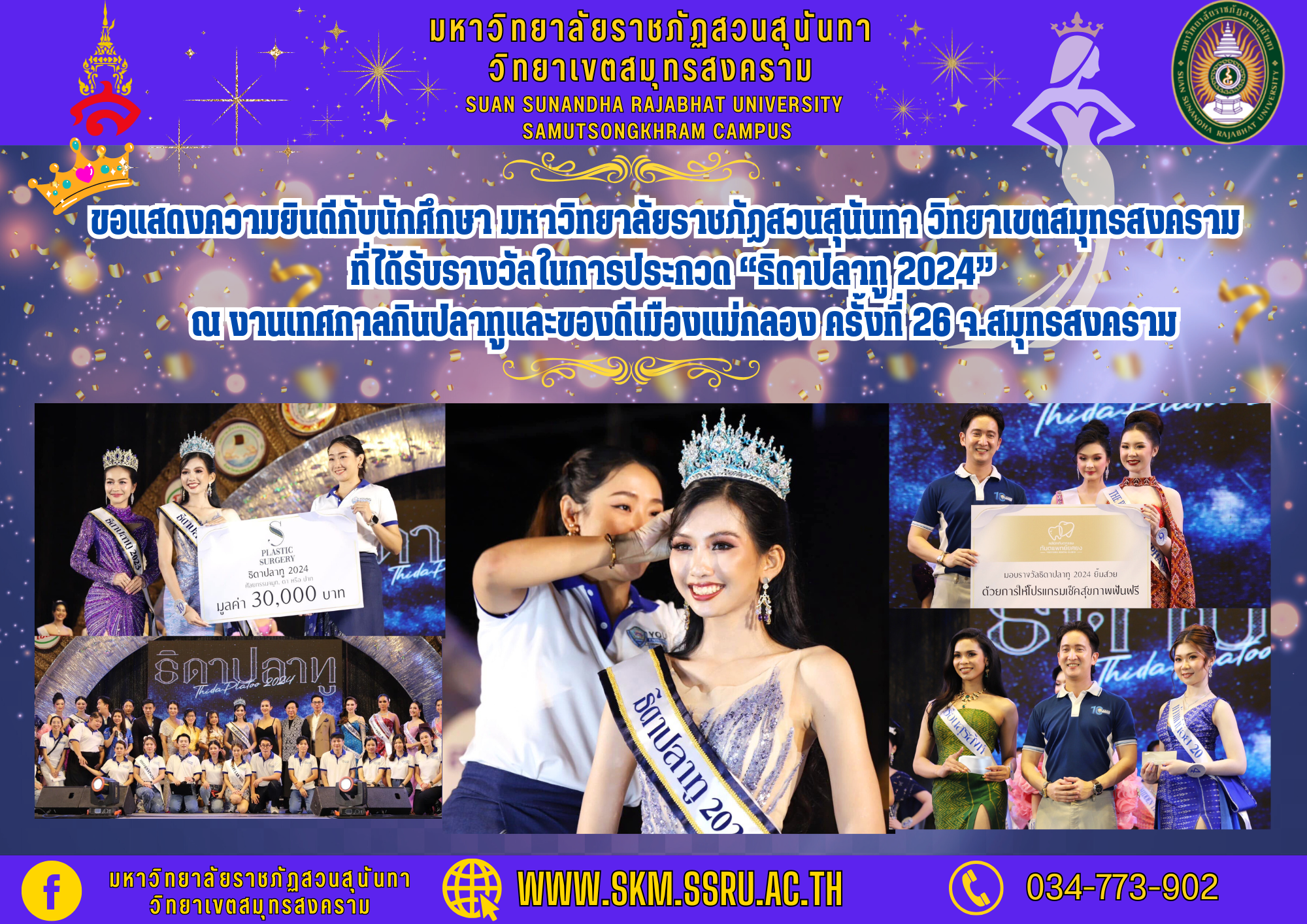 มหาวิทยาลัยราชภัฏสวนสุนันทา วิทยาเขตสมุทรสงคราม ขอแสดงความยินดีกับนักศึกษา มหาวิทยาลัยราชภัฏสวนสุนันทา วิทยาเขตสมุทรสงคราม ที่ได้รับรางวัลในการประกวดเพื่อคัดเลือกสาวงาม ในจังหวัดสมุทรสงคราม “ธิดาปลาทู 2024” ณ งานเทศกาลกินปลาทูและของดีเมืองแม่กลอง ครั้งที่ 26 ตอน ด้วยรักษ์และปลาทู จังหวัดสมุทรสงคราม ได้แก่