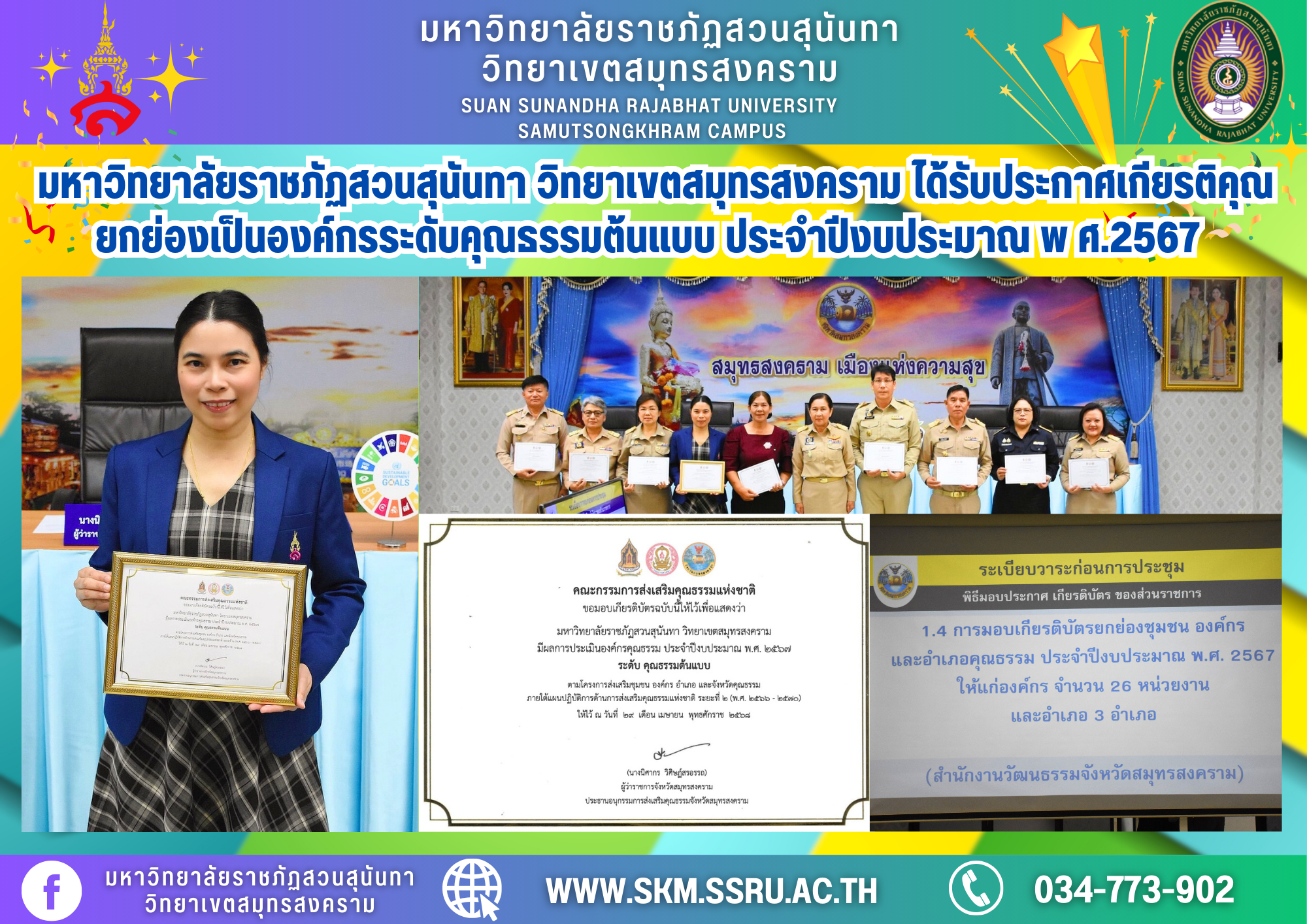 มหาวิทยาลัยราชภัฏสวนสุนันทา วิทยาเขตสมุทรสงคราม นำโดย ผู้ช่วยศาสตราจารย์ ดร.เภสัชกรหญิงพิมพร ทองเมือง รองอธิการบดีวิทยาเขตสมุทรสงคราม เข้ารับประกาศนียบัตรจากคณะกรรมการส่งเสริมคุณธรรมแห่งชาติ เพื่อได้รับยกย่องว่า มหาวิทยาลัยราชภัฏสวนสุนันทา วิทยาเขตสมุทรสงคราม มีผลการประเมินองค์กรคุณธรรม ประจำปีงบประมาณ พ.ศ.2567 “ระดับ คุณธรรมต้นแบบ” ตามโครงการส่งเสริมชุมชน องค์กร อำเภอ และจังหวัดคุณธรรม ภายใต้แผนปฏิบัติการด้านการส่งเสริมคุณธรรมแห่งชาติ ระยะที่ 2 (พ.ศ.2566 - 2570)