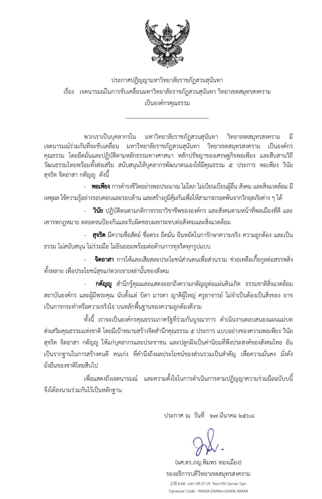 ประกาศปฏิญญามหาวิทยาลัยราชภัฏสวนสุนันทา เรื่อง เจตนารมณ์ในการขับเคลื่อน มหาวิทยาลัยราชภัฏสวนสุนันทา วิทยาเขตสมุทรสงคราม เป็นองค์กรคุณธรรม