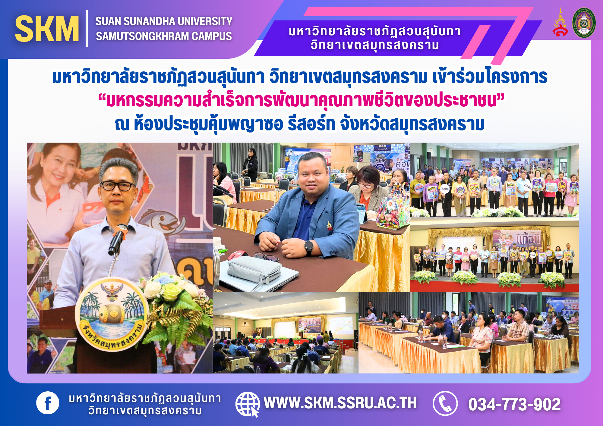 ผู้ช่วยศาสตราจารย์ ดร.เภสัชกรหญิงพิมพร ทองเมือง รองอธิการบดีวิทยาเขตสมุทรสงคราม ได้มอบหมายให้นายวุฒิไกร ประวัติพงษ์ เจ้าหน้าที่ฝ่ายบุคคล กองกลาง สำนักงานวิทยาเขตสมุทรสงคราม มหาวิทยาลัยราชภัฏสวนสุนันทา เข้าร่วมโครงการ “มหกรรมความสำเร็จการพัฒนาคุณภาพชีวิตของประชาชน”