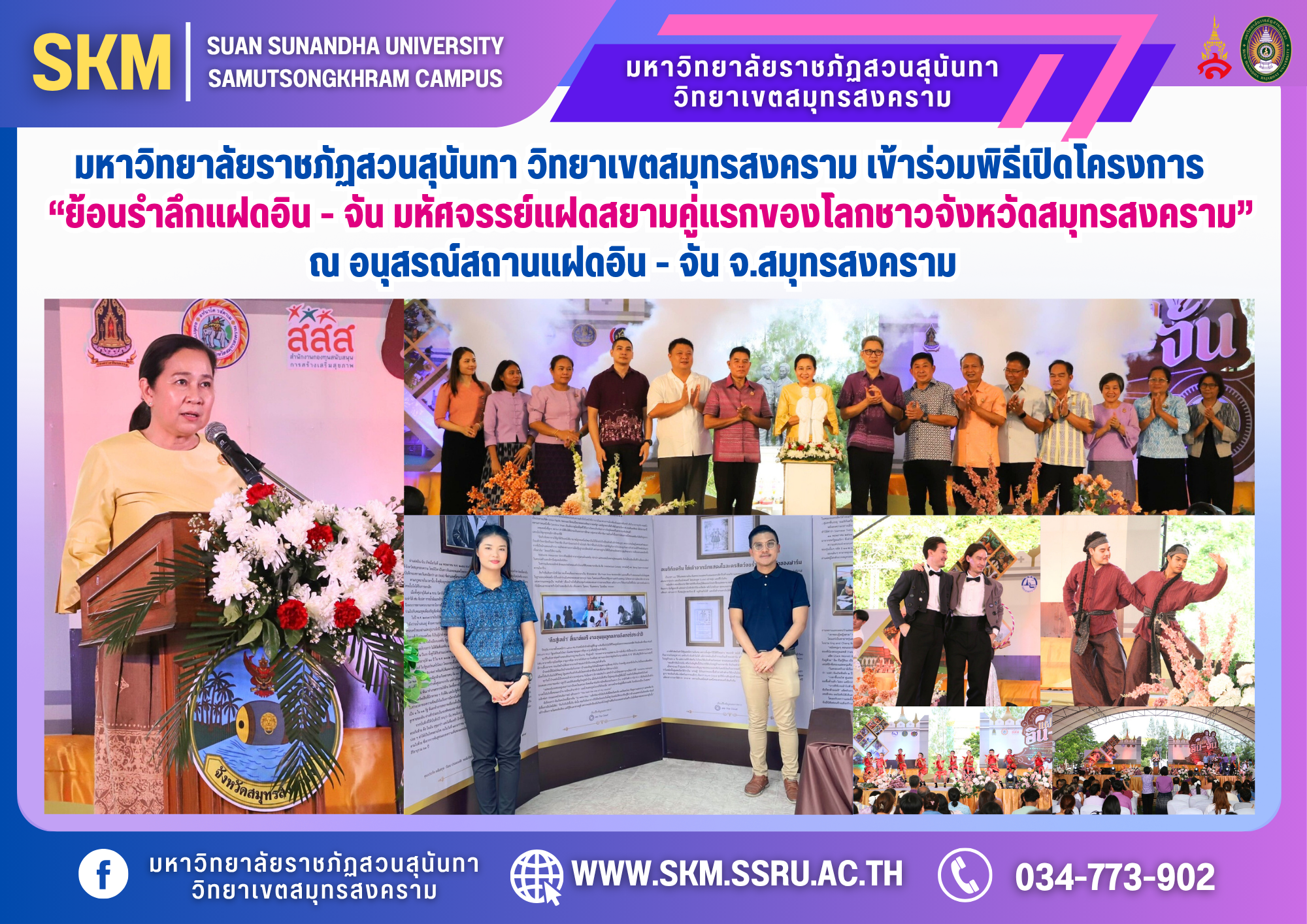 ผู้ช่วยศาสตราจารย์ ดร. เภสัชกรหญิงพิมพร ทองเมือง รองอธิการบดีวิทยาเขตสมุทรสงคราม ได้มอบหมายให้นายจิรายุส พูลสวัสดิ์ รักษาการหัวหน้าฝ่ายทรัพย์สินและรายได้ และนางสาวกรรณิกา ลีสุวรรณ์ เจ้าหน้าที่บริหารงานทั่วไป ฝ่ายทรัพย์สินและรายได้ กองกลาง สำนักงานวิทยาเขตสมุทรสงคราม มหาวิทยาลัยราชภัฏสวนสุนันทา เข้าร่วมพิธีเปิดโครงการย้อนรำลึกแฝดอิน - จัน มหัศจรรย์แฝดสยามคู่แรกของโลกชาวจังหวัดสมุทรสงคราม
