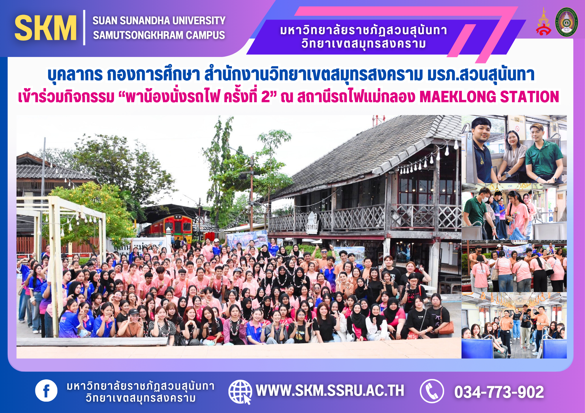 มหาวิทยาลัยราชภัฏสวนสุนันทา วิทยาเขตสมุทรสงคราม นำโดย ผู้ช่วยศาสตราจารย์ ดร.เภสัชกรหญิงพิมพร ทองเมือง รองอธิการบดีวิทยาเขตสมุทรสงคราม ได้มอบหมายให้นางสาวพัชรา แสงนวล เจ้าหน้าที่บริหารงานทั่วไป นายอริยเมศฐ์ ศิริฤกษ์รัตนา นักวิชาการศึกษา และนายสุรเชษฐ์ นิลสาย นักวิชาการศึกษา กองการศึกษา สำนักงานวิทยาเขตสมุทรสงคราม เข้าร่วมสนับสนุนการจัดกิจกรรม “พาน้องนั่งรถไฟ ครั้งที่ 2” ณ สถานีรถไฟแม่กลอง Maeklong Station โดยมีนักศึกษา ชั้นปีที่ 1 และรุ่นพี่ สาขาวิชาวิทยาศาสตร์สุขภาพและความงาม สาขาวิชาสาธารณสุขชุมชน และสาขาวิชาเลขานุการการแพทย์และสาธารณสุข วิทยาลัยสหเวชศาสตร์ มหาวิทยาลัยราชภัฏสวนสุนันทา เข้าร่วมกิจกรรม
