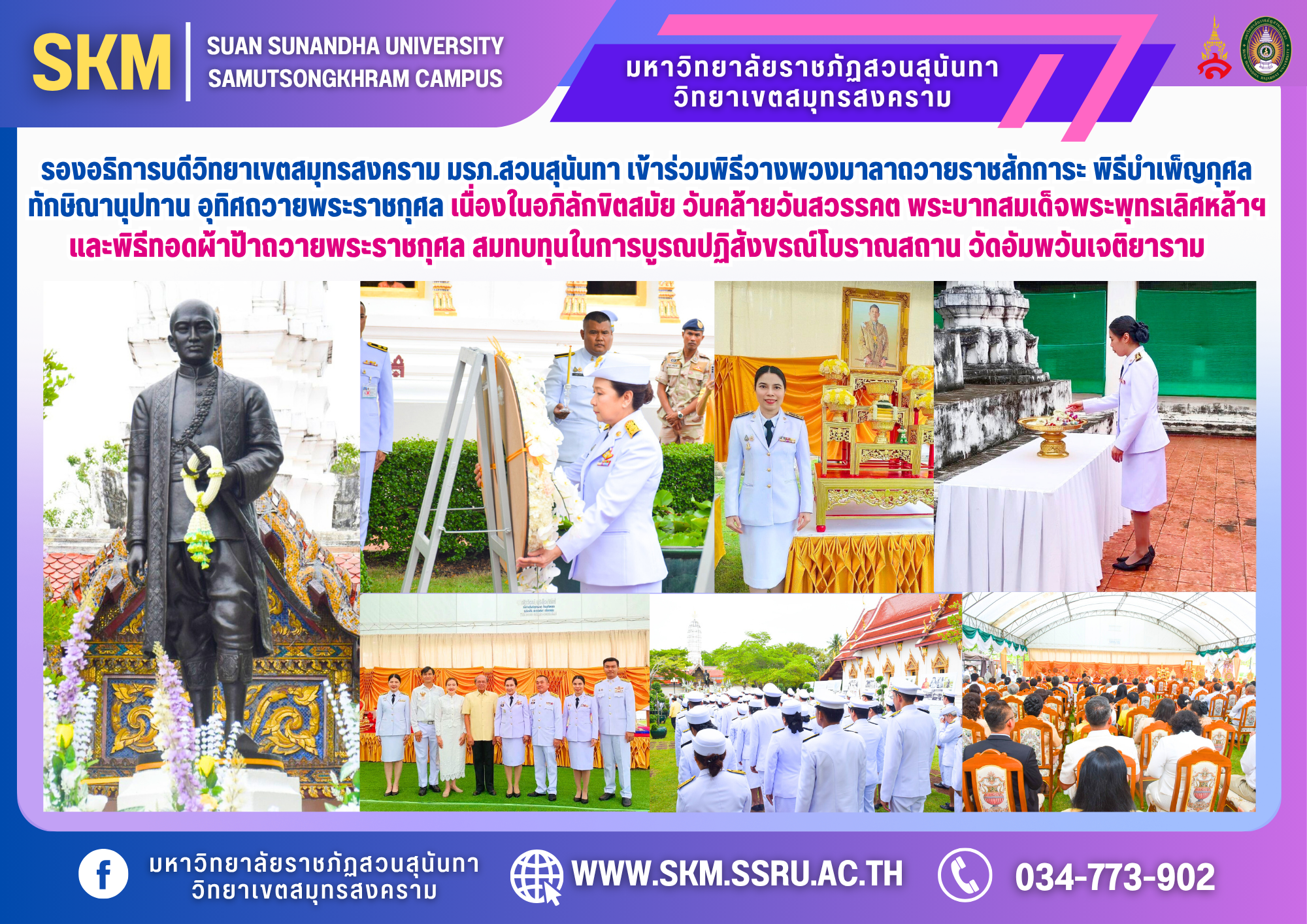 มหาวิทยาลัยราชภัฏสวนสุนันทา วิทยาเขตสมุทรสงคราม นำโดย ผู้ช่วยศาสตราจารย์ ดร.เภสัชกรหญิงพิมพร ทองเมือง รองอธิการดีวิทยาเขตสมุทรสงคราม ได้เข้าร่วมพิธีวางพวงมาลา ถวายราชสักการะ พิธีบำเพ็ญกุศลทักษิณานุปทาน อุทิศถวายพระราชกุศล เนื่องในอภิลักขิตสมัย วันคล้ายวันสวรรคต พระบาทสมเด็จพระพุทธเลิศหล้านภาลัย และพิธีทอดผ้าป้าถวายพระราชกุศล สมทบทุนในการบูรณปฏิสังขรณ์โบราณสถาน วัดอัมพวันเจติยาราม