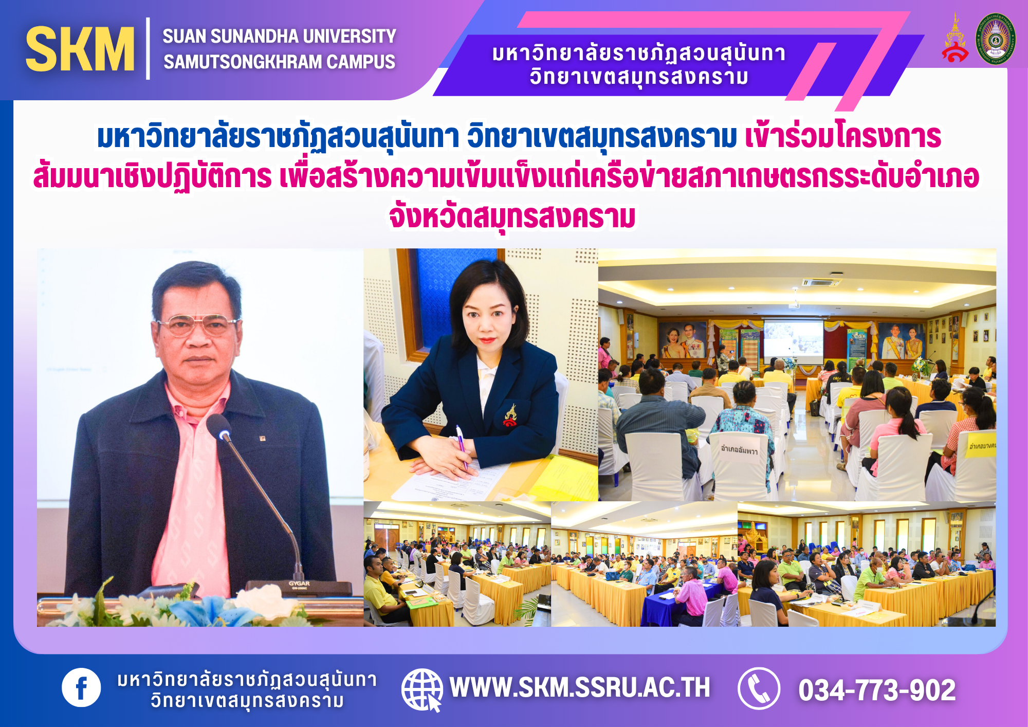 มหาวิทยาลัยราชภัฏสวนสุนันทา วิทยาเขตสมุทรสงคราม นำโดย ผู้ช่วยศาสตราจารย์ ดร.เภสัชกรหญิงพิมพร ทองเมือง รองอธิการดีวิทยาเขตสมุทรสงคราม ได้มอบหมายให้นางสาวสุพรรณราย สงวนไทร รักษาการหัวหน้าฝ่ายอาคารและสถานที่ กองกลาง สำนักงานวิทยาเขตสมุทรสงคราม เข้าร่วมโครงการสัมมนาเชิงปฏิบัติการเพื่อสร้างความเข้มแข็งแก่เครือข่ายสภาเกษตรกรระดับอำเภอ จังหวัดสมุทรสงคราม