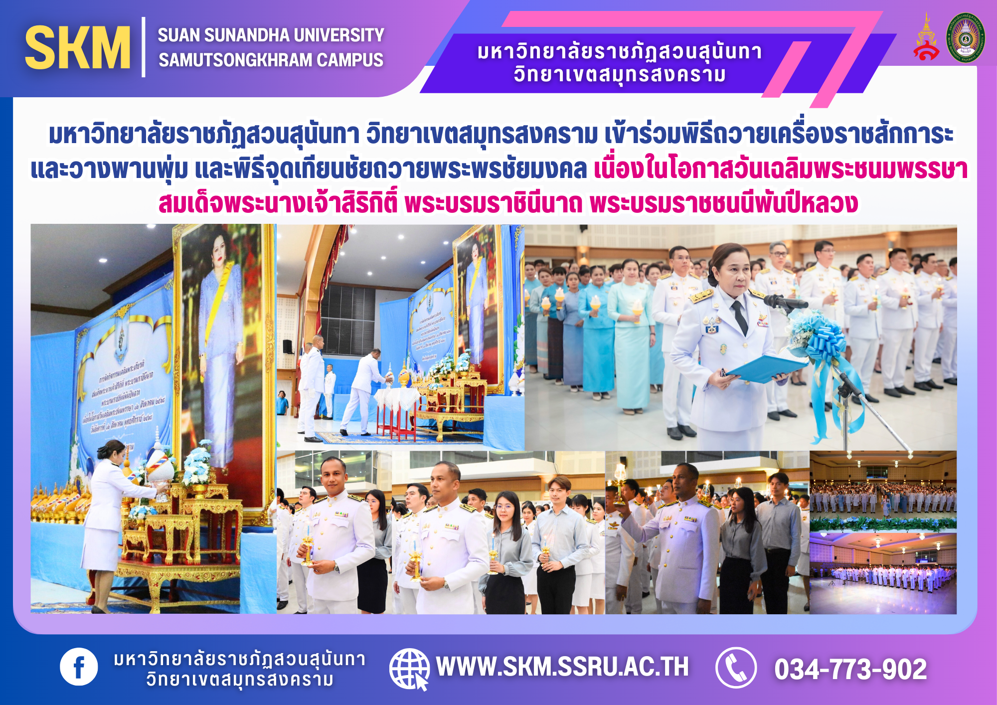 มหาวิทยาลัยราชภัฏสวนสุนันทา วิทยาเขตสมุทรสงคราม นำโดย ผู้ช่วยศาสตราจารย์ ดร.เภสัชกรหญิงพิมพร ทองเมือง รองอธิการบดีวิทยาเขตสมุทรสงคราม ได้มอบหมายให้ นายเอกนรินทร์ ปิยะปัญญามงคล รักษาการในตำแหน่งผู้อำนวยการสำนักงานวิทยาเขตสมุทรสงคราม พร้อมด้วยนางสาวปภาวี พวงวาสนา เจ้าหน้าที่บริหารงานทั่วไป และนายอริยเมศฐ์ ศิริฤกษ์รัตนา นักวิชาการศึกษา กองกลาง สำนักงานวิทยาเขตสมุทรสงคราม เข้าร่วมพิธีถวายเครื่องราชสักการะและวางพานพุ่ม และพิธีจุดเทียนชัยถวายพระพรชัยมงคล เนื่องในโอกาสวันเฉลิมพระชนมพรรษาสมเด็จพระนางเจ้าสิริกิติ์ พระบรมราชินีนาถ พระบรมราชชนนีพันปีหลวง