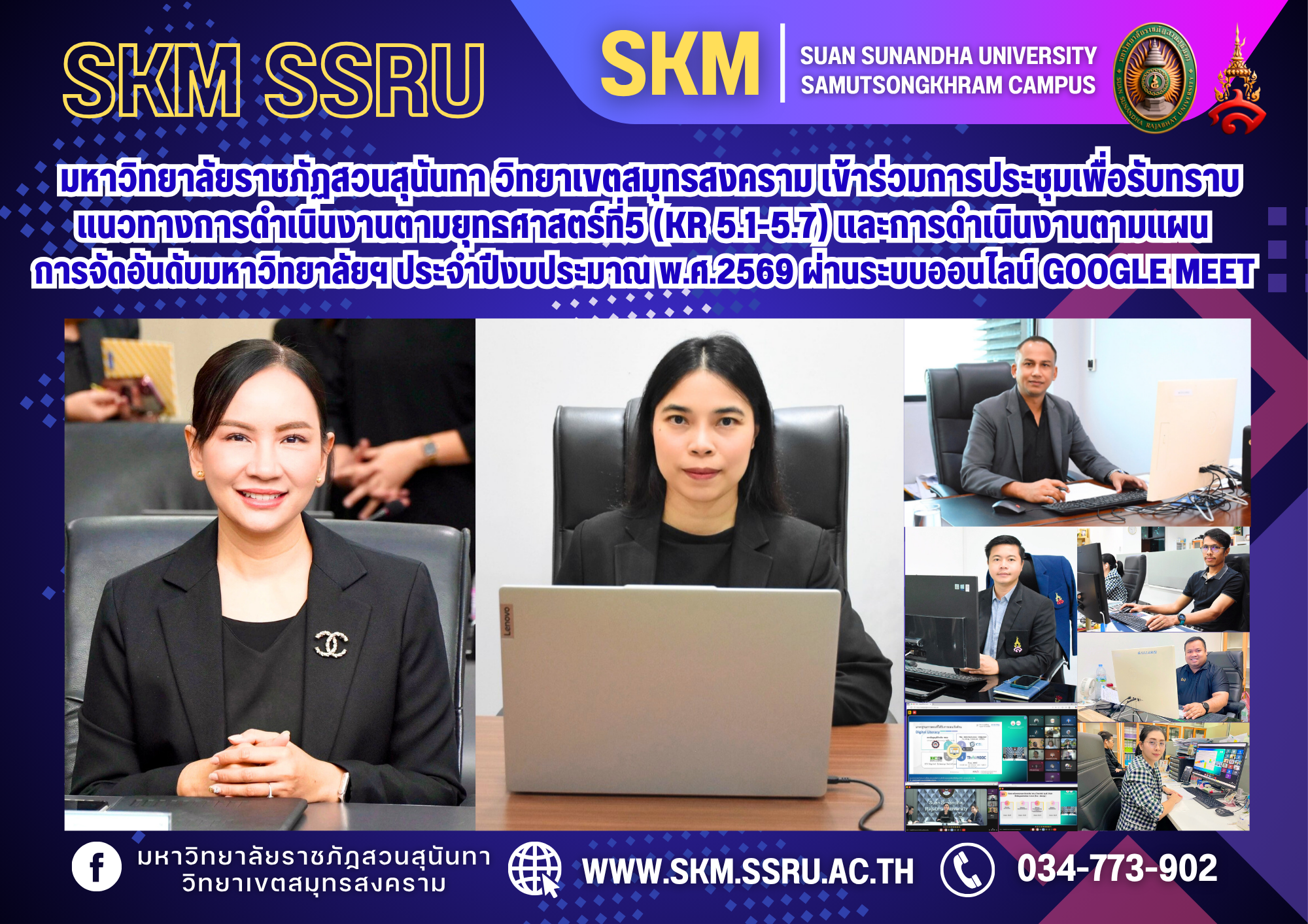 วันพฤหัสบดีที่ 30 ตุลาคม พ.ศ. 2568 เวลา 13.00 น. มหาวิทยาลัยราชภัฏสวนสุนันทา วิทยาเขตสมุทรสงคราม นำโดย ผู้ช่วยศาสตราจารย์ ดร. เภสัชกรหญิงพิมพร ทองเมือง รองอธิการบดีวิทยาเขตสมุทรสงคราม พร้อมด้วยนายเอกนรินทร์ ปิยะปัญญามงคล รักษาการในตำแหน่งผู้อำนวยการสำนักงานวิทยาเขตสมุทรสงคราม นายเอกชน น้อยเงิน ผู้อำนวยการกองกลาง สำนักงานวิทยาเขตสมุทรสงคราม หัวหน้าฝ่ายฯ และบุคลากร สำนักงานวิทยาเขตสมุทรสงคราม เข้าร่วมการประชุมเพื่อรับทราบแนวทางการดำเนินงานตามยุทธศาสตร์ที่5 (KR 5.1-5.7) และการดำเนินงานตามแผนการจัดอันดับมหาวิทยาลัยฯ ประจำปีงบประมาณ พ.ศ.2569