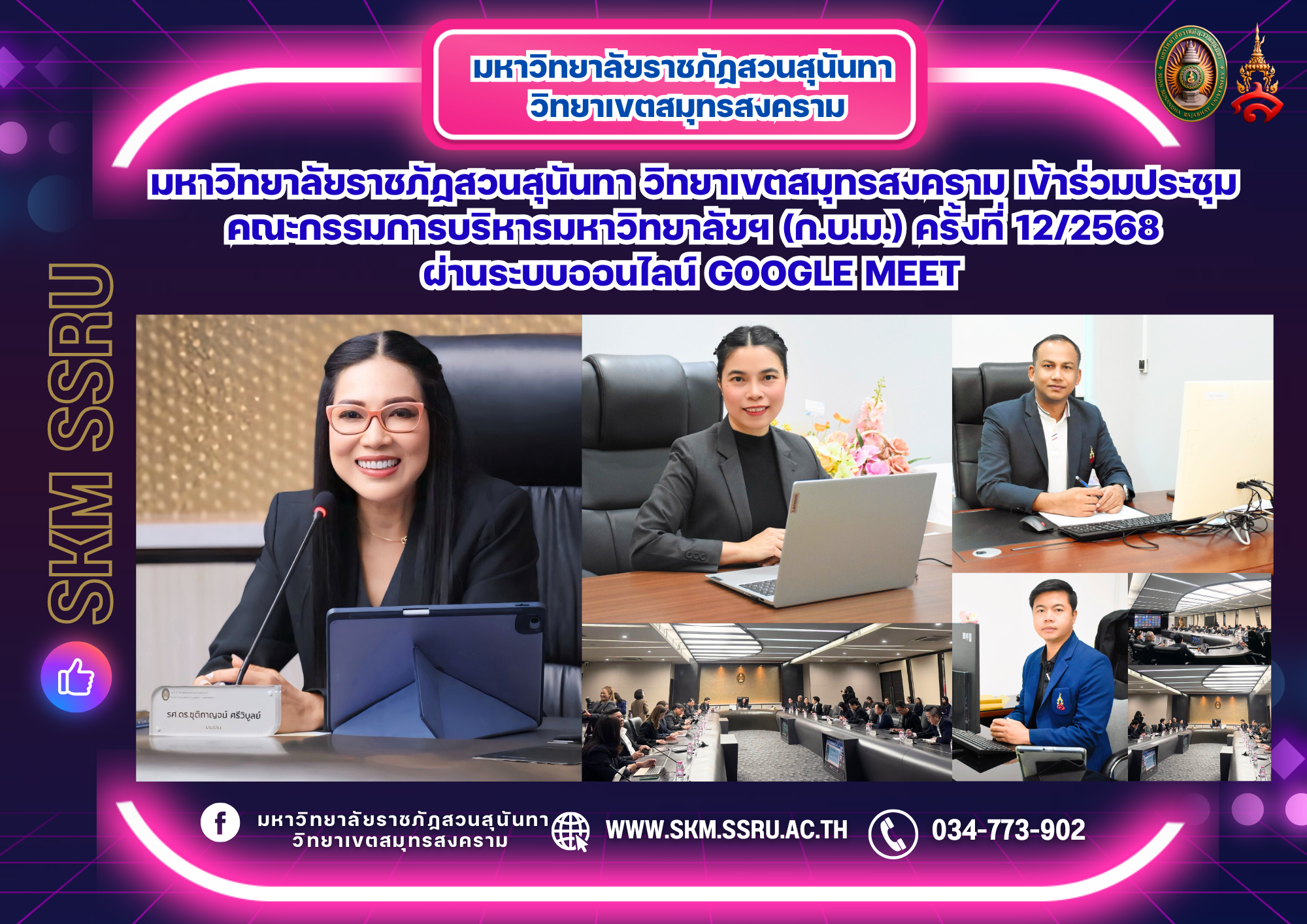 มหาวิทยาลัยราชภัฏสวนสุนันทา วิทยาเขตสมุทรสงคราม นำโดย ผู้ช่วยศาสตราจารย์ ดร.เภสัชกรหญิงพิมพร ทองเมือง รองอธิการบดีวิทยาเขตสมุทรสงคราม พร้อมด้วยนายเอกนรินทร์ ปิยะปัญญามงคล รักษาการในตำแหน่งผู้อำนวยการสำนักงานวิทยาเขตสมุทรสงคราม และนายเอกชน น้อยเงิน ผู้อำนวยการกองกลาง สำนักงานวิทยาเขตสมุทรสงคราม ได้เข้าร่วมการประชุมคณะกรรมการบริหารมหาวิทยาลัย (ก.บ.ม.) ครั้งที่ 12/2568