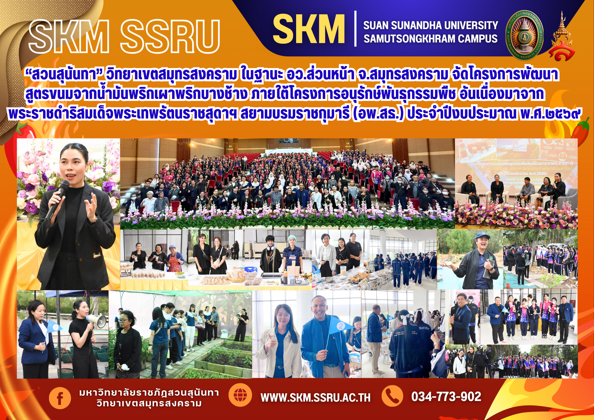 วันศุกร์ที่ ๑๒ ธันวาคม พ.ศ.๒๕๖๘ เวลา ๐๘.๐๐ – ๑๓.๐๐ น. ณ หอประชุมเบญจศิลาดล (หอประชุม ๕๐๐ ที่นั่ง) อาคารศรีสุนันท์ มหาวิทยาลัยราชภัฏสวนสุนันทา วิทยาเขตสมุทรสงคราม ในฐานะ อว.ส่วนหน้าจังหวัดสมุทรสงคราม นำโดย ผู้ช่วยศาสตราจารย์ ดร.เภสัชกรหญิงพิมพร ทองเมือง รองอธิการบดีวิทยาเขตสมุทรสงคราม พร้อมด้วยนายเอกนรินทร์ ปิยะปัญญามงคล รักษาการในตำแหน่งผู้อำนวยการสำนักงานวิทยาเขตสมุทรสงคราม นายเอกชน น้อยเงิน ผู้อำนวยการกองกลาง สำนักงานวิทยาเขตสมุทรสงคร คณาจารย์ และบุคลากร สำนักงานวิทยาเขตสมุทรสงคราม/หน่วยงานภายในกำกับ ดำเนินการจัดโครงการ พัฒนาสูตรขนมจากน้ำมันพริกเผาพริกบางช้าง ภายใต้โครงการอนุรักษ์พันธุกรรมพืช อันเนื่องมาจากพระราชดำริสมเด็จพระเทพรัตนราชสุดาฯ สยามบรมราชกุมารี (อพ.สธ.) ประจำปีงบประมาณ พ.ศ. 2569 เพื่อส่งเสริมการใช้ประโยชน์ทรัพยากรท้องถิ่นอย่างคุ้มค่า พร้อมพัฒนาต่อยอดผลิตภัณฑ์สู่เชิงพาณิชย์