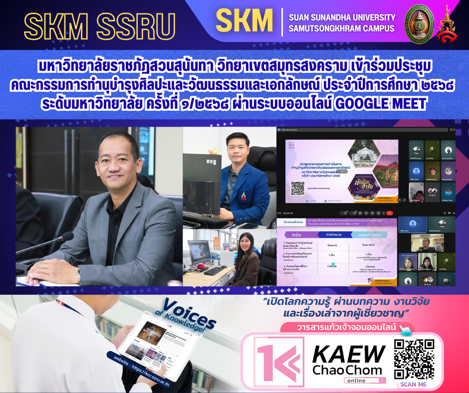 วันพุธที่ ๑๑ กุมภาพันธ์ พ.ศ.๒๕๖๙ เวลา ๑๐.๐๐ น. มหาวิทยาลัยราชภัฏสวนสุนันทา วิทยาเขตสมุทรสงคราม นำโดย นายเอกชน น้อยเงิน ผู้อำนวยการกองกลาง สำนักงานวิทยาเขตสมุทรสงคราม พร้อมด้วย นางสาวภัคนิษฐ์กา จันทร์จิราวัฒน์ รักษาการหัวหน้าฝ่ายบริการการศึกษา กองการศึกษา สำนักงานวิทยาเขตสมุทรสงคราม เข้าร่วมการประชุมคณะกรรมการทำนุบำรุงศิลปะและวัฒนธรรมและเอกลักษณ์ ประจำปีการศึกษา ๒๕๖๘ ระดับมหาวิทยาลัย ครั้งที่ ๑/๒๕๖๘ โดยเป็นการประชุมในรูปแบบออนไลน์ ผ่านระบบ Google Meet เพื่อร่วมกำหนดแนวทาง ขับเคลื่อน และวางแผนการดำเนินงานด้านการทำนุบำรุงศิลปะและวัฒนธรรม รวมถึงการส่งเสริมอัตลักษณ์ของมหาวิทยาลัยให้เป็นไปอย่างมีประสิทธิภาพและสอดคล้องกับนโยบายของมหาวิทยาลัย