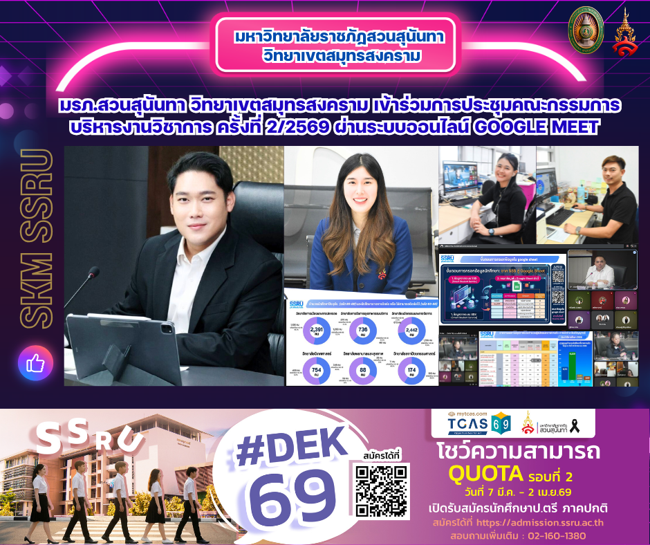 วันอังคารที่ 24 มีนาคม พ.ศ.2569 เวลา 13.00 น. มหาวิทยาลัยราชภัฏสวนสุนันทา วิทยาเขตสมุทรสงคราม นำโดย ผู้ช่วยศาสตราจารย์ ดร. เภสัชกรหญิงพิมพร ทองเมือง รองอธิการบดีวิทยาเขตสมุทรสงคราม ได้มอบหมายให้ นางสาวภัคนิษฐ์กา จันทร์จิราวัฒน์ รักษาการหัวหน้าฝ่ายบริการการศึกษา และบุคลากร กองการศึกษา สำนักงานวิทยาเขตสมุทรสงคราม เข้าร่วมการประชุมคณะกรรมการบริหารงานวิชาการ ครั้งที่ 2/2569 ซึ่งจัดขึ้นผ่านระบบออนไลน์ Google Meet เพื่อร่วมขับเคลื่อนและพัฒนางานด้านวิชาการของมหาวิทยาลัยให้มีประสิทธิภาพและสอดคล้องกับนโยบายในยุคดิจิทัล