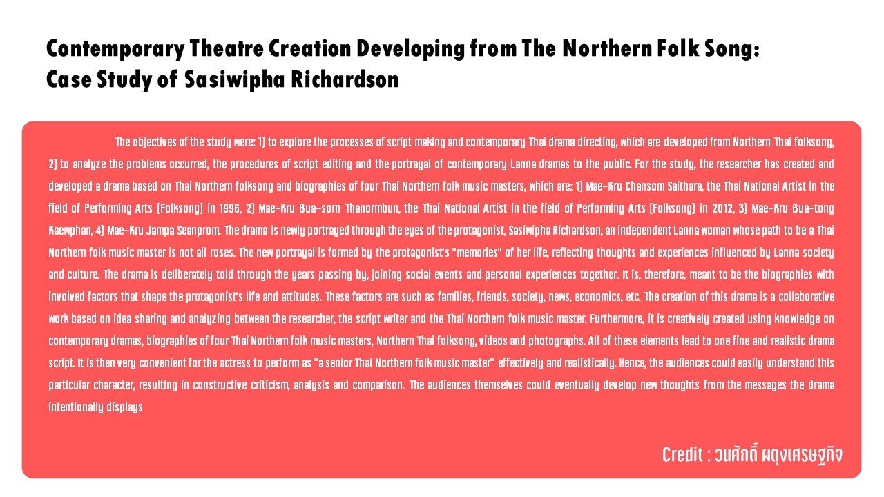 หน้าหลัก > ข่าว > > Contemporary Theatre Creation Developing from The Northern Folk Song: Case Study of Sasiwipha Richardson
